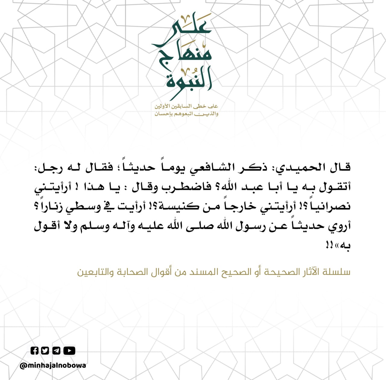 قال الحميدي: ذكر الشافعي يوماً حديثاً؛ فقال له رجل: أتقـول بـه يـا أبا عبد الله ؟ فاضطرب وقال : يا هذا ! أرأيتني نصرانياً ؟! أرأيتني خارجاً من كنيسة ؟! أرأيت في وسطي زناراً ؟ أروي حديثاً عن رسول الله صلى الله عليه وآله وسلم ولا أقول به» !!