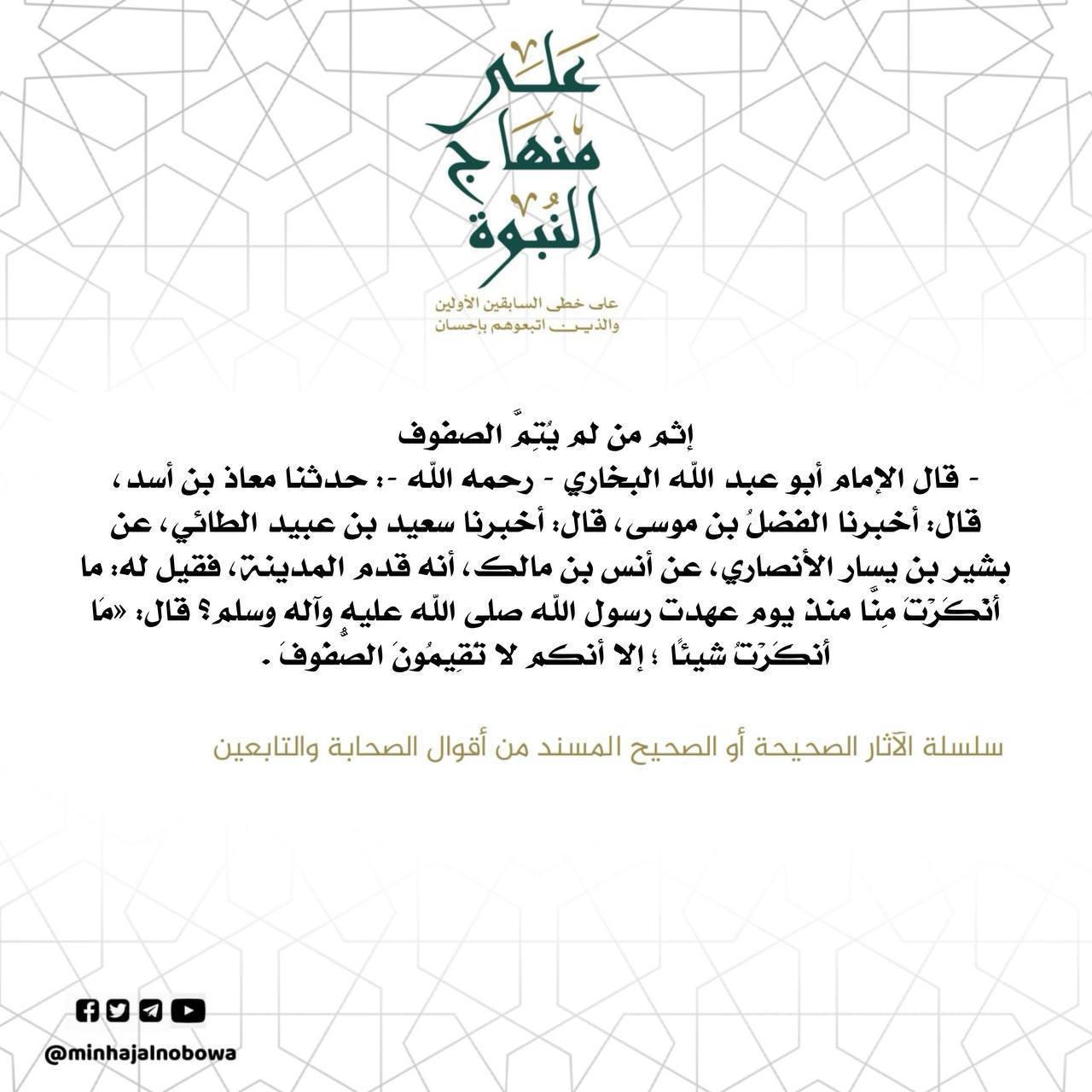 قال الامام أبو عبد الله البخاري - رحمه الله- : حدثنا معاذ بن أسد، قال: أخبرنا الفضل بن موسى، قال: أخبرنا سعيد بن عبيد الطائي، عن بشير بن يسار الأنصاري، عن أنس بن مالك، أنه قدم المدينة: فقيل له: ما أنكَرْتَ منَا منذ يوم عهدت رسول الله صلى الله عليه وآله وسلم؟ قال: "ما أنكَرْتَ…