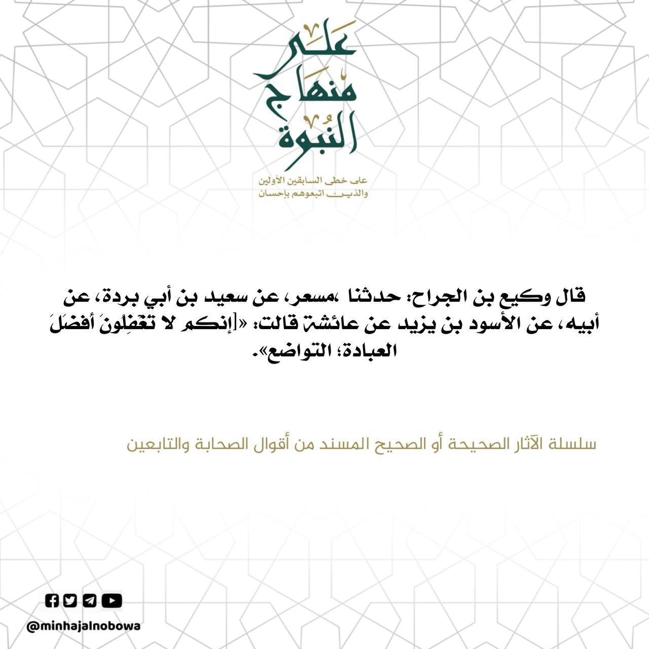 قال وكيع بن الجراح: حدثنا مسعر، عن سعيد بن أبي بردة، عن أبيه، عن الأسود بن يزيد عن عائشة، قالت: «إنكم لا تغفلونَ أفضل العبادة؛ التواضع». سلسلة الآثار الصحيحة أو الصحيح المسند من أقوال الصحابة والتابعين