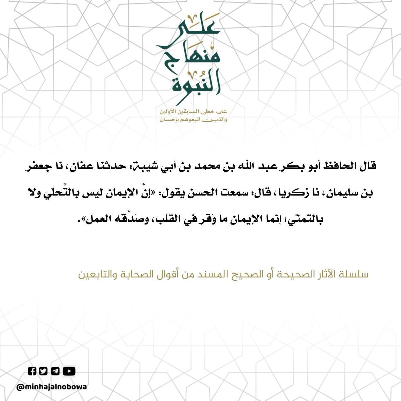 قال الحافظ أبو بكر عبد الله بن محمد بن أبي شيبة: حدثنا عفان، نا جعفر بن سليمان؛ نا زكريا، قال: سمعت الحسن يقول: «إنَّ الايمان ليس بالتّحلي ولا بالتمنّي؛ إنما الايمان ما وَقر في القلب، وصَدّقه العمل». سلسلة الآثار الصحيحة أو الصحيح المسند من أقوال الصحابة والتابعين