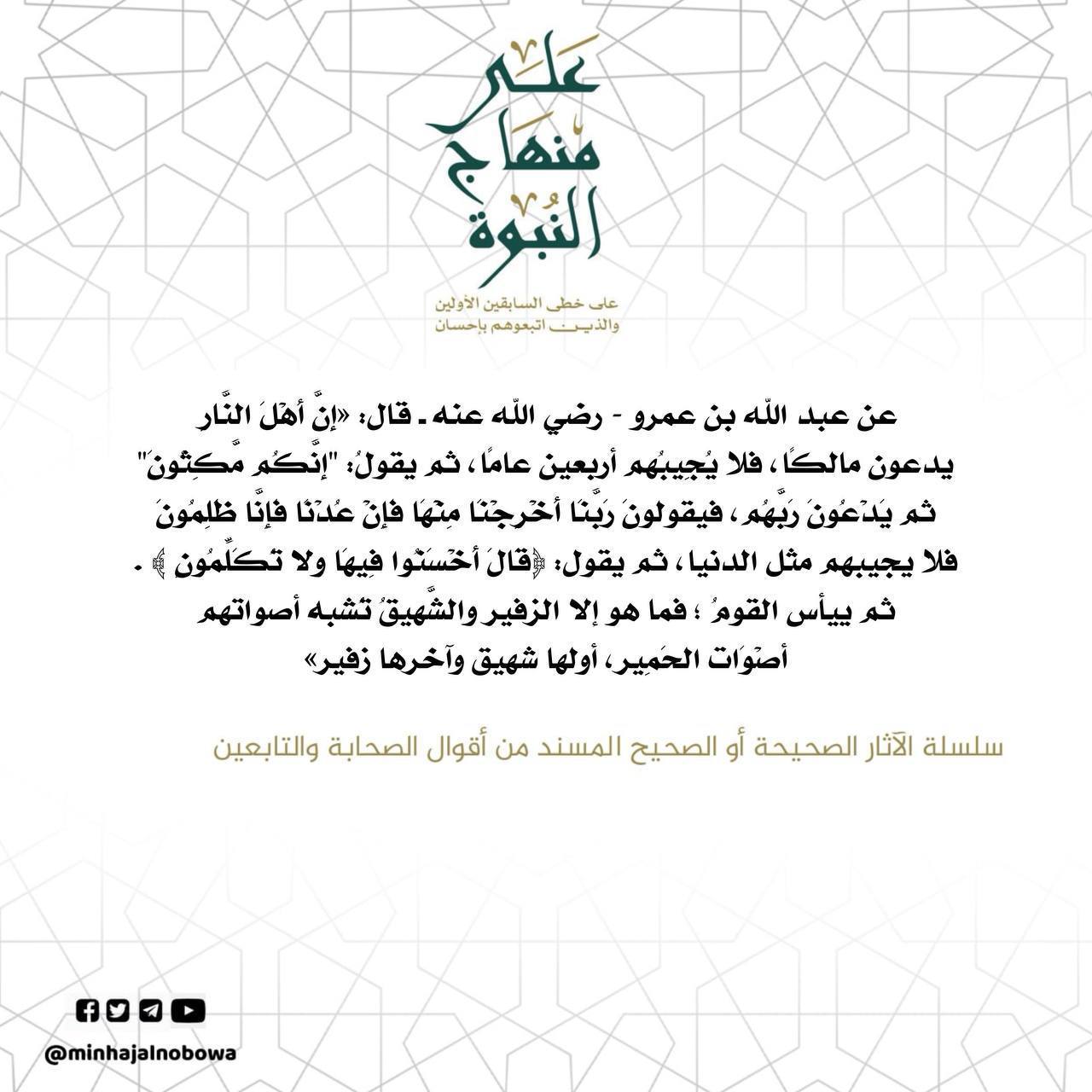 عن عبد الله بن عمرو - رضي الله عنه قال: «إنَّ أهْلَ النَّار يدعون مالكاً، فلا يُجِيبُهم أربعين عاما، ثم يقول: ﴿إِنَّكُمْ مَاكِثُونَ﴾ ثم يَدْعُونَ رَبَّهُم، فيقولون ﴿رَبَّنا أخْرِجْنَا منها فإنَ عُدْنا فإنا ظَلِمُونَ﴾ فلا يجيبهم مثل الدنيا، ثم يقول: ﴿قال اخسئوا فِيها ولا تُكَلِّمُونَ﴾ ثم ييأس القومُ ؛ فما هو إلا الزفير والشَّهيق تشبه…