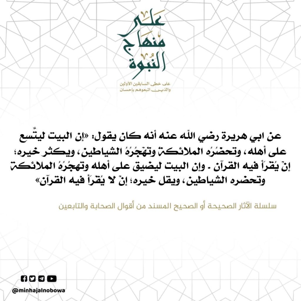 عن ابي هريرة رضي الله عنه أنه كان يقول: «إن البيت ليتَّسع على أهله، وتحضره الملائكة وتهجُرُهُ الشياطين، ويكثر خيره؛ إن يُقرأ فيه القرآن . وإن البيت ليضيق على أهله وتهجره الملائكة وتحضره الشياطين، ويقل خيره؛ إن لا يقرأ فيه القرآن»