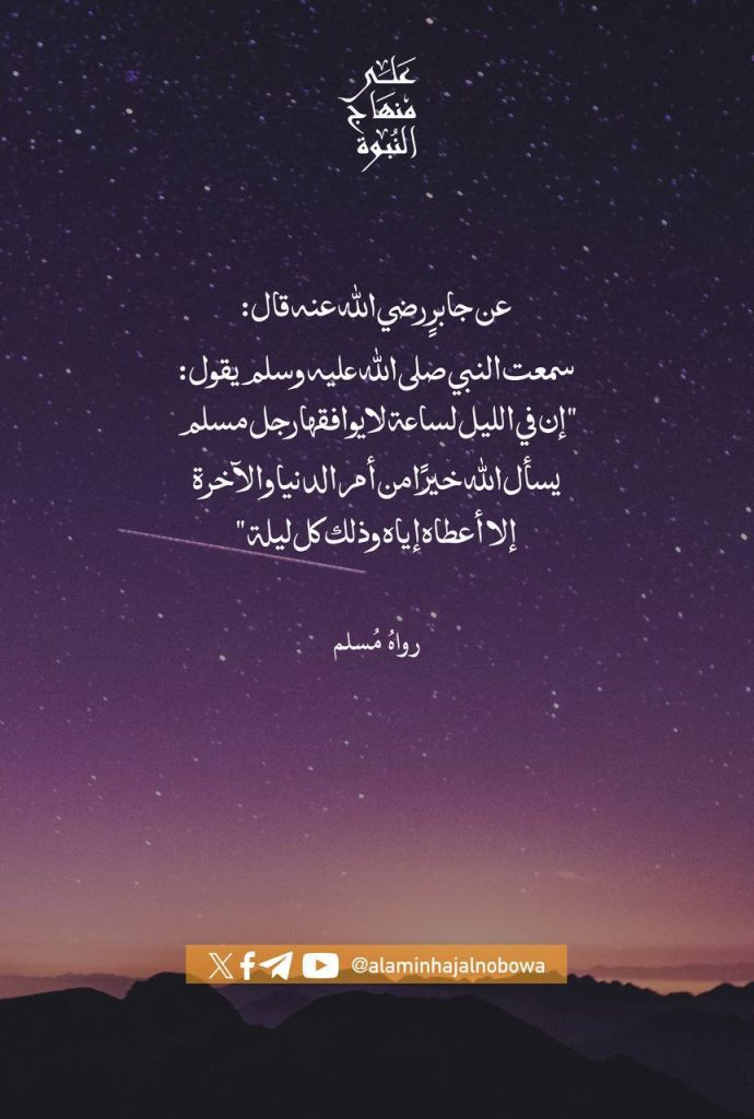 عن جابر رضي الله عنه قال: سمعت رسول الله صلى الله عليه وسلم يقول: «إن في الليل لساعة، لا يُوَافِقُهَا رجُلٌ مُسلم يَسأل الله تعالى خيرًا من أمْرِ الدنيا والآخرة، إلا أعْطَاه إِياه، وذلك كُلَّ ليلة». [صحيح] - [رواه مسلم]