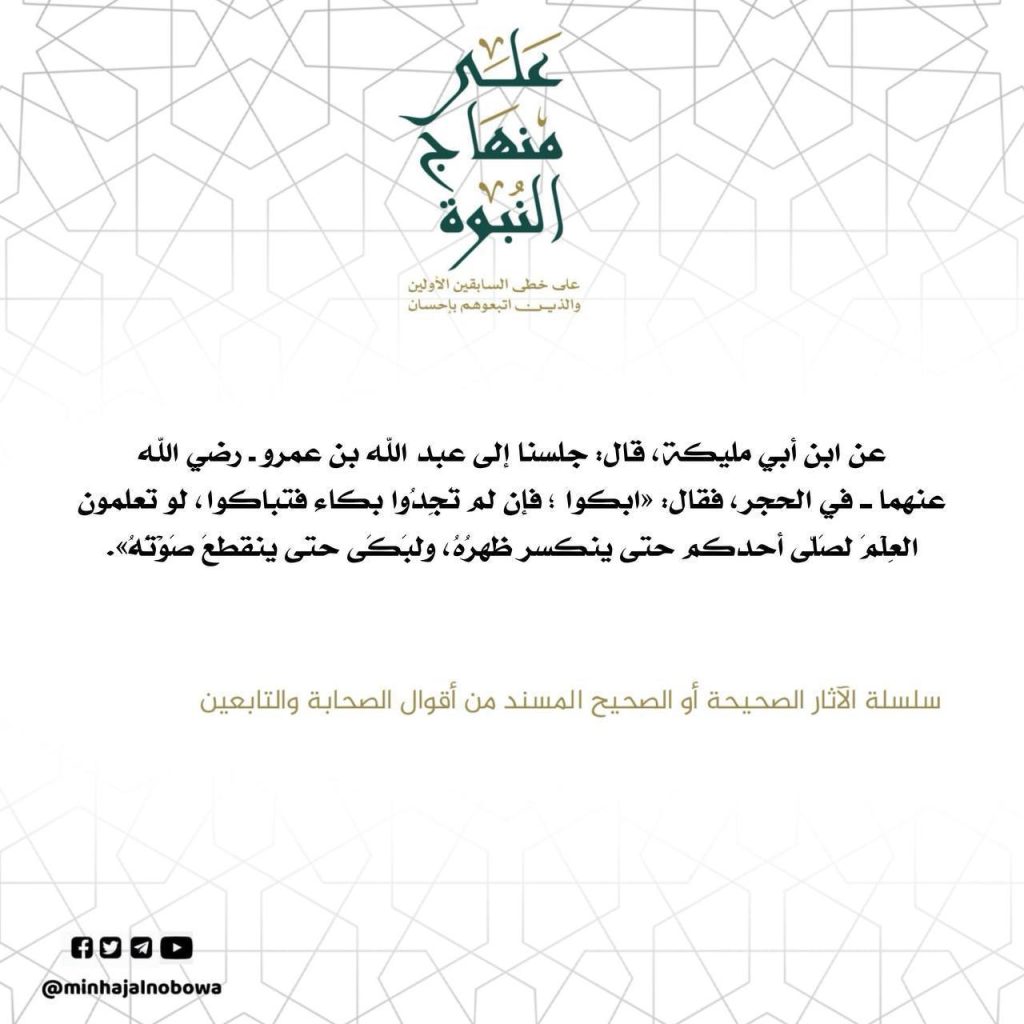 عن ابن أبي مليكة: قال: جلسنا إلى عبد الله بن عمرو -رضي الله عنهما- في الحجر، فقال: «ابكوا ؛ فإن لم تَجِدُوا بكاء فتباكوا، لو تعلمون العِلم لَصَلّى أحدكم حتى ينكسر ظهرُهُ، ولبكى حتى ينقطعَ صوتُهُ». سلسلة الآثار الصحيحة أو الصحيح المسند من أقوال الصحابة والتابعين