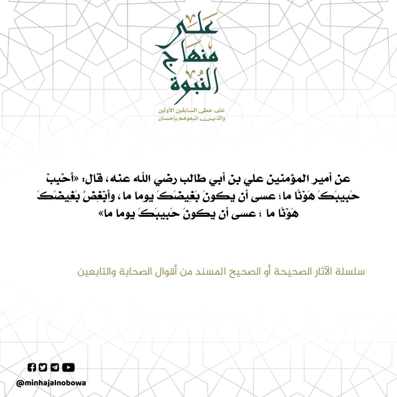 عن أمير المؤمنين علي بن أبي طالب رضي الله عنه، قال: «أحْبِبْ حَبيبَكَ هَوْنًا ما؛ عسى أن يكونَ بَغيضُكَ يوماً ما، وأبْغِضْ بَغِيضَكَ هَوْناً ما ؛ عسى أن يكونَ حبيبَك يوما ما» سلسلة الآثار الصحيحة أو الصحيح المسند من أقوال الصحابة والتابعين