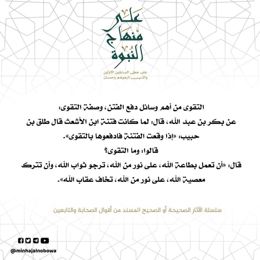 التقوى من أهم وسائل دفع الفتن، وصفة التقوى: عن بكر بن عبد الله، قال: لما كانت فتنة ابن الأشعث قال طلق بن حبيب: «إذا وقعت الفتنة فادفعوها بالتقوى». قالوا: وما التقوى؟ قال: «أن تعمل بطاعة الله، على نور من الله، ترجو ثواب اللّه، وأن تترك معصية اللّه، على نور من الله ، تخاف عقاب الله».…