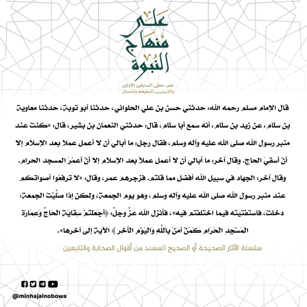 قال الإمام مسلم رحمه الله: حدثني حسن بن علي الحلواني، حدثنا أبو توبة،حدثنا معاوية بن سلام، عن زيد بن سلام، أنه سمع أبا سلام، قال: حدثني النعمان بن بشير، قال: «كنت عند منبر رسول الله صلى الله عليه وآله وسلم، فقال رجل: ما أبالي أن لا أعمل عملا بعد الإسلام إلا أن أسقي الحاج. وقال…