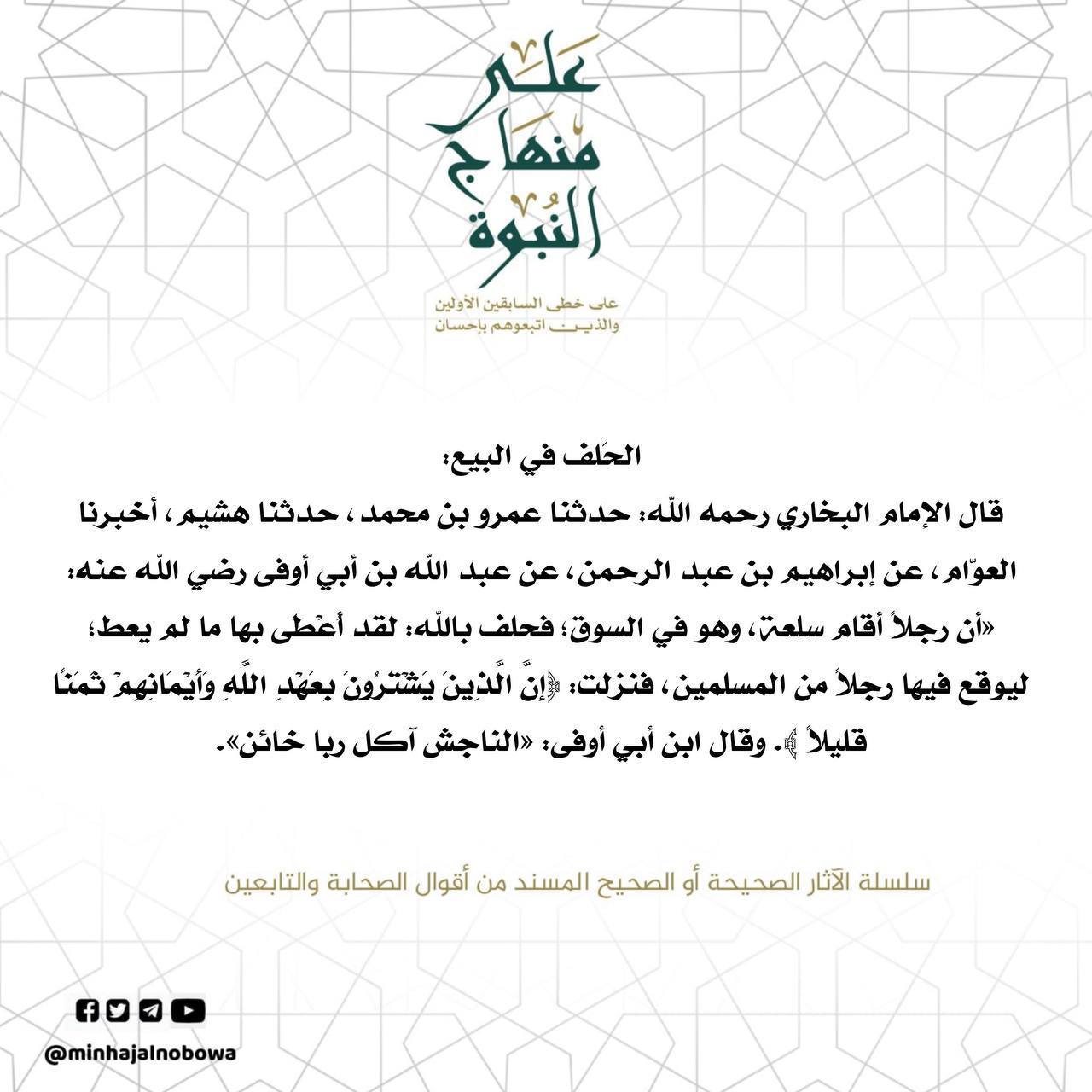 الحلف في البيع: قال الامام البخاري رحمه الله، حدثنا عمرو بن محمد، حدثنا هشيم، أخبرنا العوّام، عن إبراهيم بن عبد الرحمن، عن عبد الله بن أبي أوفى رضي الله عنه، «أن رجلا أقام سلعة، وهو في السوق، فحلف بالله، لقد أعْطى بها ما لم يعط؛ ليوقع فيها رجلاً من المسلمين، فنزلت: (إنََ الَّذينَ يَشترُون بعَهْدِ…