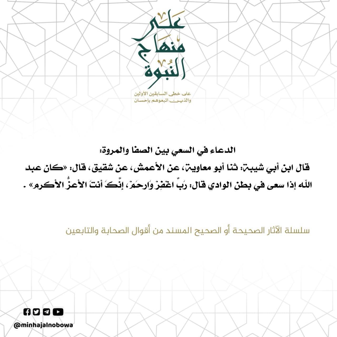 قال ابن أبي شيبة: ثنا أبو معاوية، عن الأعمش، عن شقيق، قال: «كان عبد الله إذا سعى في بطن الوادي قال: ررَبِّ اغَفِرْ وَارحَمْ ، إنَك أنت الأعزُّ الأكرم» . سلسلة الآثار الصحيحة أو الصحيح المسند من أقوال الصحابة والتابعين