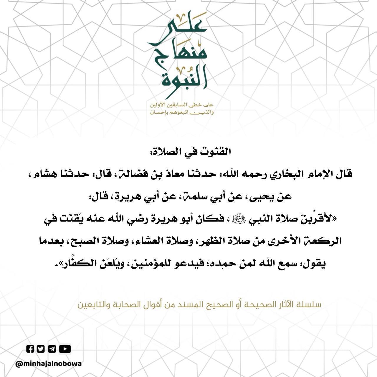 قال الامام البخاري رحمه الله: حدثنا معاذ بن فضالة، قال: حدثنا هشام، عن يحيى، عن أبي سلمة، عن أبي هريرة، قال: «لأقرّبن صلاة النبي (صلى الله عليه وسلم)، فكان أبو هريرة رضي الله عنه يَقنت في الركعة الأخرى من صلاة الظهر، وصلاة العشاء، وصلاة الصبح، بعدما يقول: سمع الله لمن حمده؛ فيدعو للمؤمنين؛ ويلعن الكفّار».…
