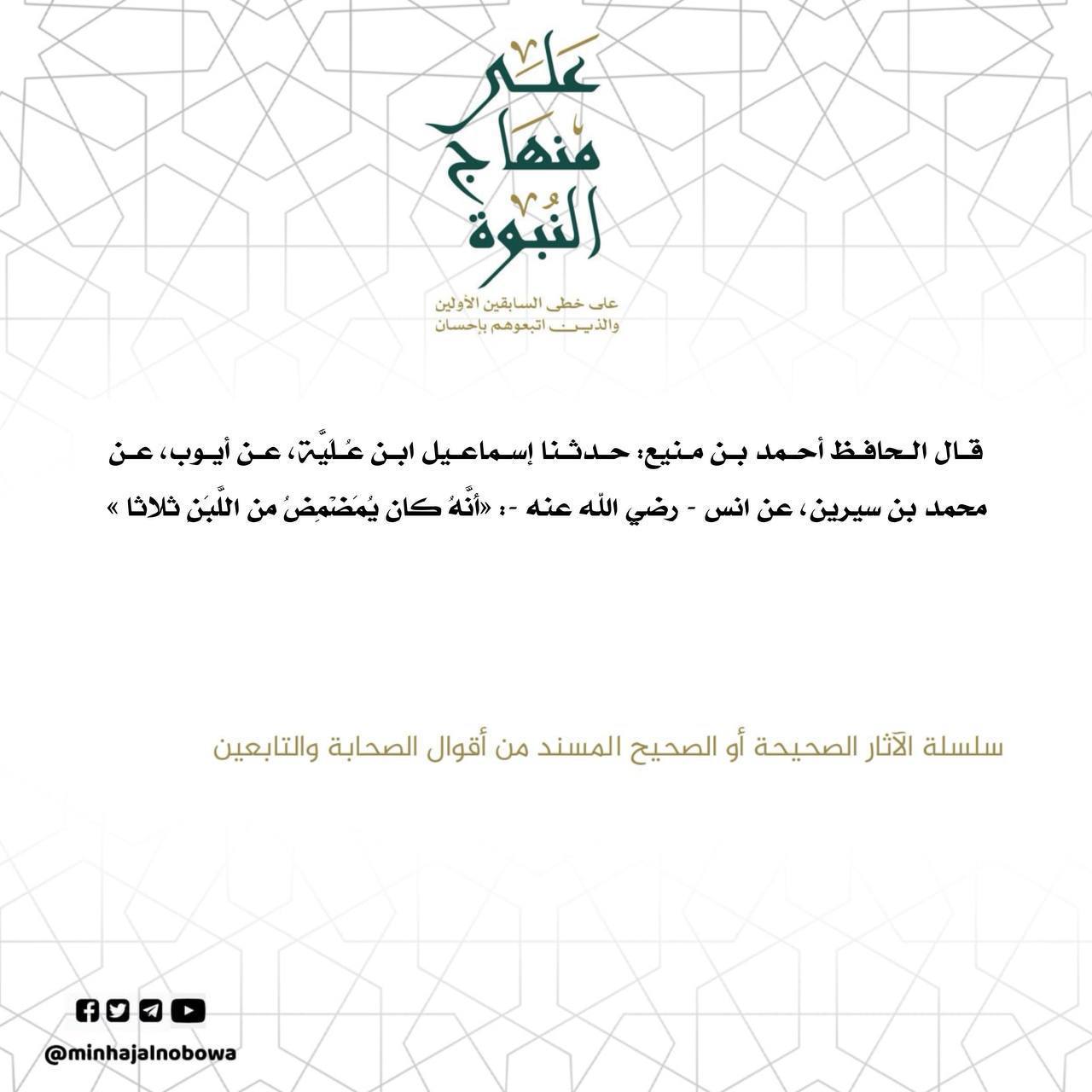 قال الحافظ أحمد بن منيع: حدثنا إسماعيل ابن عُليَّة، عن أيوب، عن محمد بن سيرين، عن انس - رضي الله عنه -: «أنَّهُ كان يُمَضْمِضُ من اللّبَنِ ثلاثا » سلسلة الآثار الصحيحة أو الصحيح المسند من أقوال الصحابة والتابعين