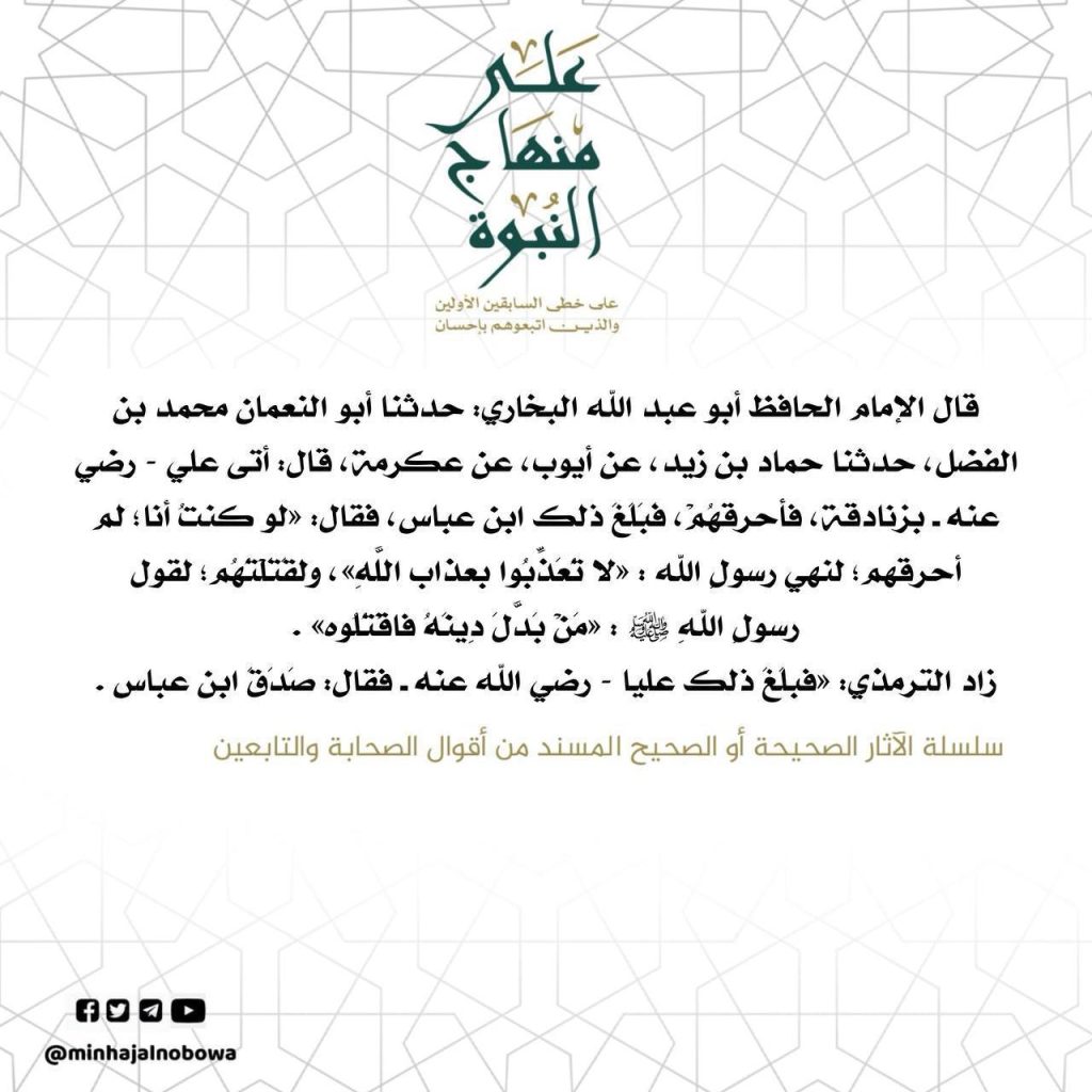 قال الامام الحافظ أبو عبد الله البخاري: حدثنا أبو النعمان محمد بن الفضل، حدثنا حماد بن زيد، عن أيوب، عن عكرمة، قال: أتى علي - رضي عنه بزنادقة، فأحرقهُمْ، فبلغ ذلك ابن عباس، فقال: «لو كنتُ أنا؛ لم أحرقهم؛ لنهي رسول الله : «لا تُعَذِّبُوا بعذاب اللهِ» ولقتلتهم؛ لقول رسول الله ﷺ: «من بَدَّل…