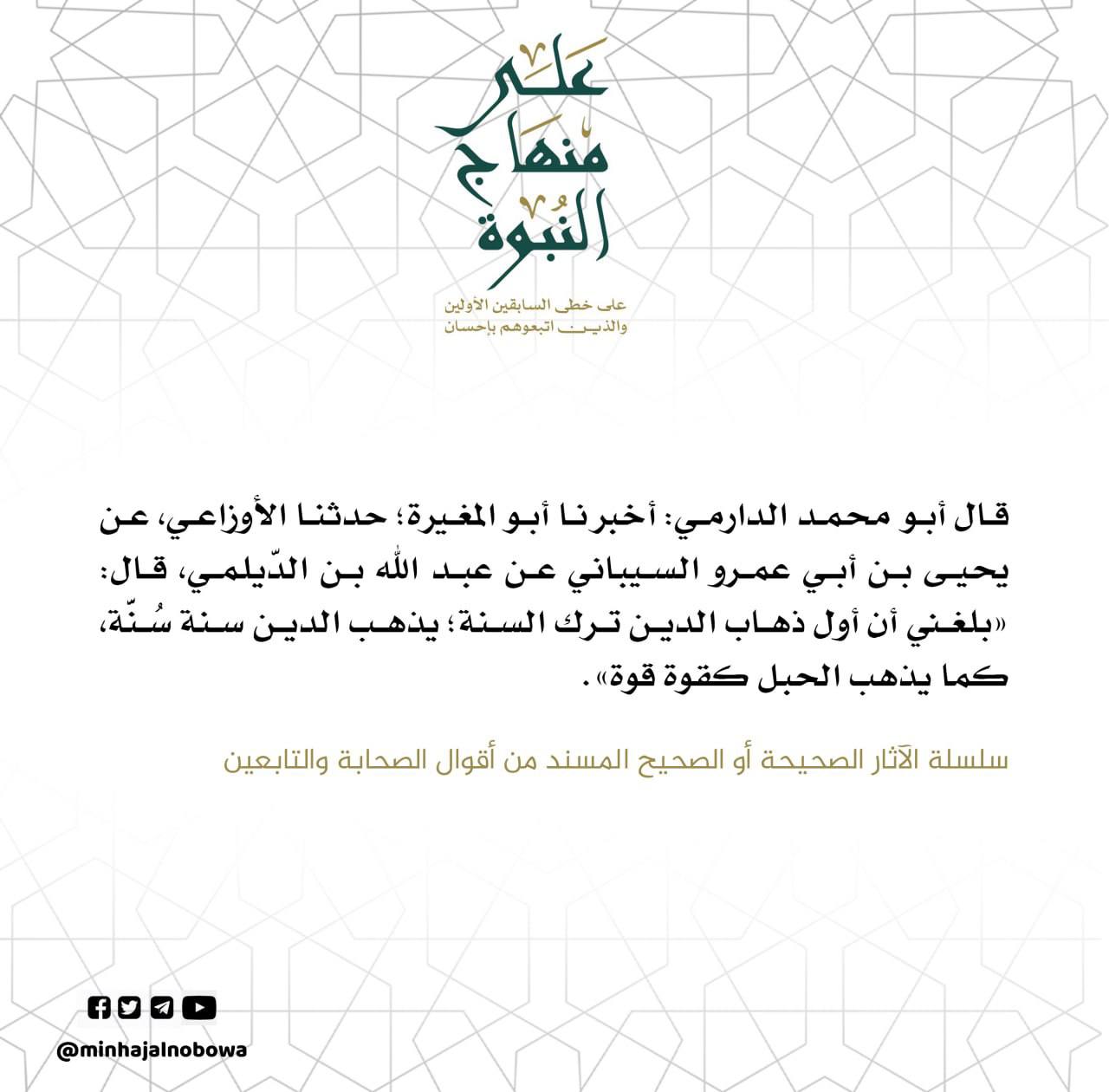 قال أبو محمد الدارمي : أخبرنا أبو المغيرة؛ حدثنا الأوزاعي، عن يحيى بن أبي عمرو السيباني عـن عبـد الله بن الديلمي، قال: بلغني أن أول ذهاب الدين ترك السنة؛ يذهب الدين سنة سُنّة كما يذهب الحبل كقوة قوة».