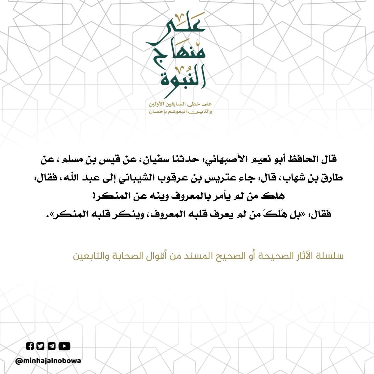 قال الحافظ أبو نعيم الأصبهاني: حدثنا سفيان، عن قيس بن مسلم،عن طارق بن شهاب، قال: جاء عتريس بن عرقوب الشيباني إلى عبد الله، فقال: هلك من لم يأمر بالمعروف وينه عن المنكر! فقال: «بل هَلكَ من لم يعرف قلبه المعروف، وينكر قلبه المنكر». سلسلة الآثار الصحيحة أو الصحيح المسند من أقوال الصحابة والتابعين