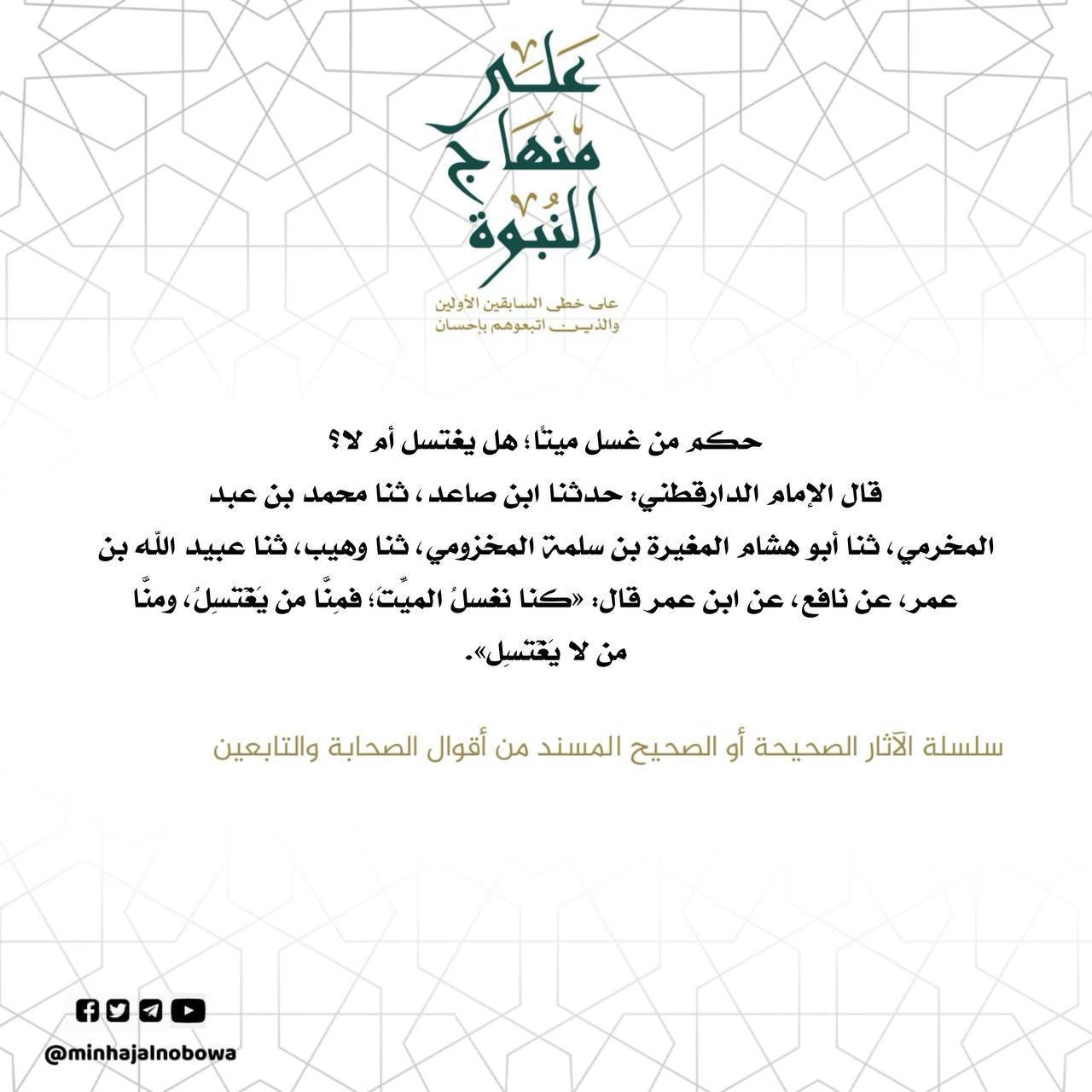 فال الإمام الدارقطني: حدثنا ابن صاعد، ثنا محمد بن عبد المخرمي، ثنا أبو هشام المغيرة بن سلمة المخزومي، ثنا وهيب، ثنا عبيد الله بن عمر، عن نافع، عن ابن عمر قال: «كنا نغسل الميِّت؛ فمِنَّا من يَغتسِل، ومنَّا من لا يغتسِل». سلسلة الآثار الصحيحة أو الصحيح المسند من أقوال الصحابة والتابعين