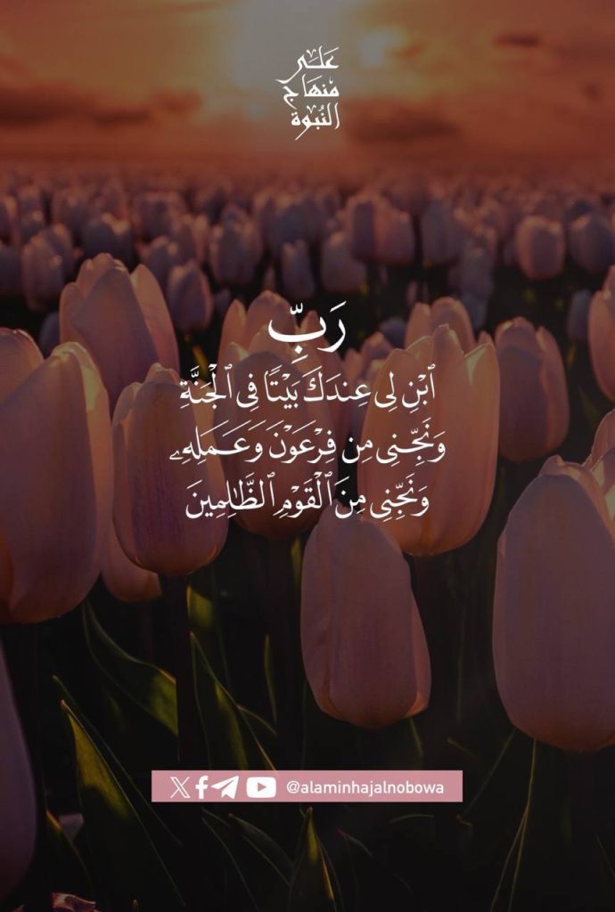 ﴿ وَضَرَبَ اللَّهُ مَثَلًا لِّلَّذِينَ آمَنُوا امْرَأَتَ فِرْعَوْنَ إِذْ قَالَتْ رَبِّ ابْنِ لِي عِندَكَ بَيْتًا فِي الْجَنَّةِ وَنَجِّنِي مِن فِرْعَوْنَ وَعَمَلِهِ وَنَجِّنِي مِنَ الْقَوْمِ الظَّالِمِينَ﴾ [ التحريم: 11]
