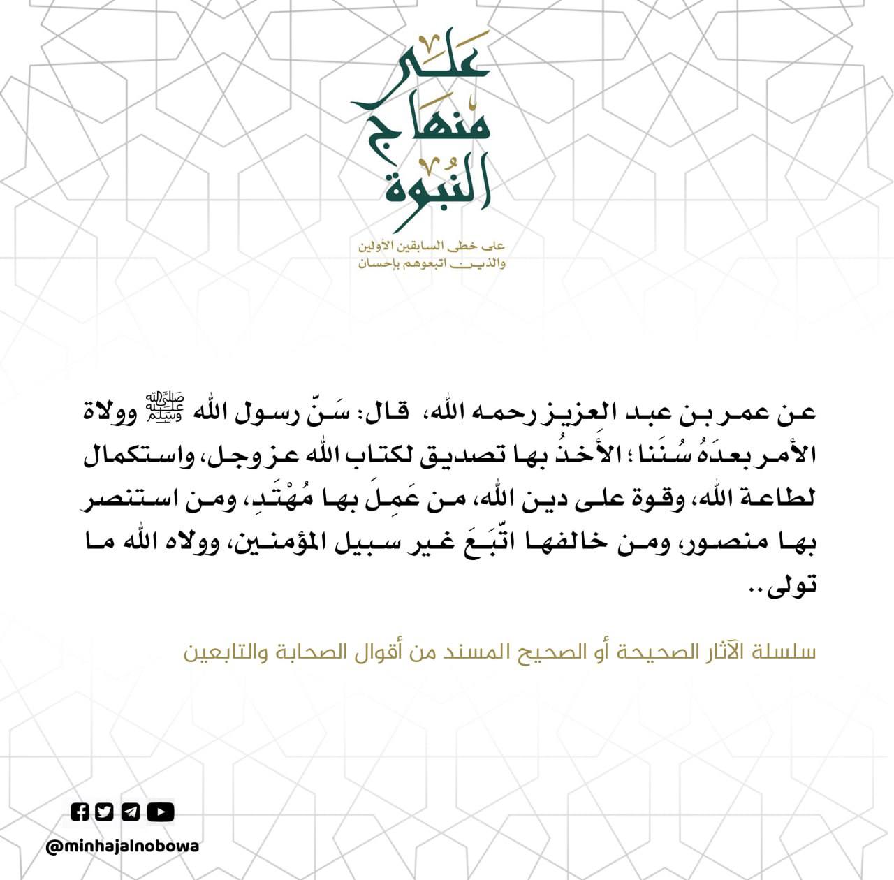 عن عمر بن عبد العزيز رحمه الله، قال: سَنّ رسول الله الأمر بعدَهُ سُنَنا؛ الأخذ بها تصديق لكتاب الله عز وجل، واستكمال لطاعة الله، وقوة على دين الله من عَمِلَ بها مُهْتَدِ، ومن استنصر بها منصور، ومن خالفها اتِّبَعَ غير سبيل المؤمنين، وولاه الله ما تولى...