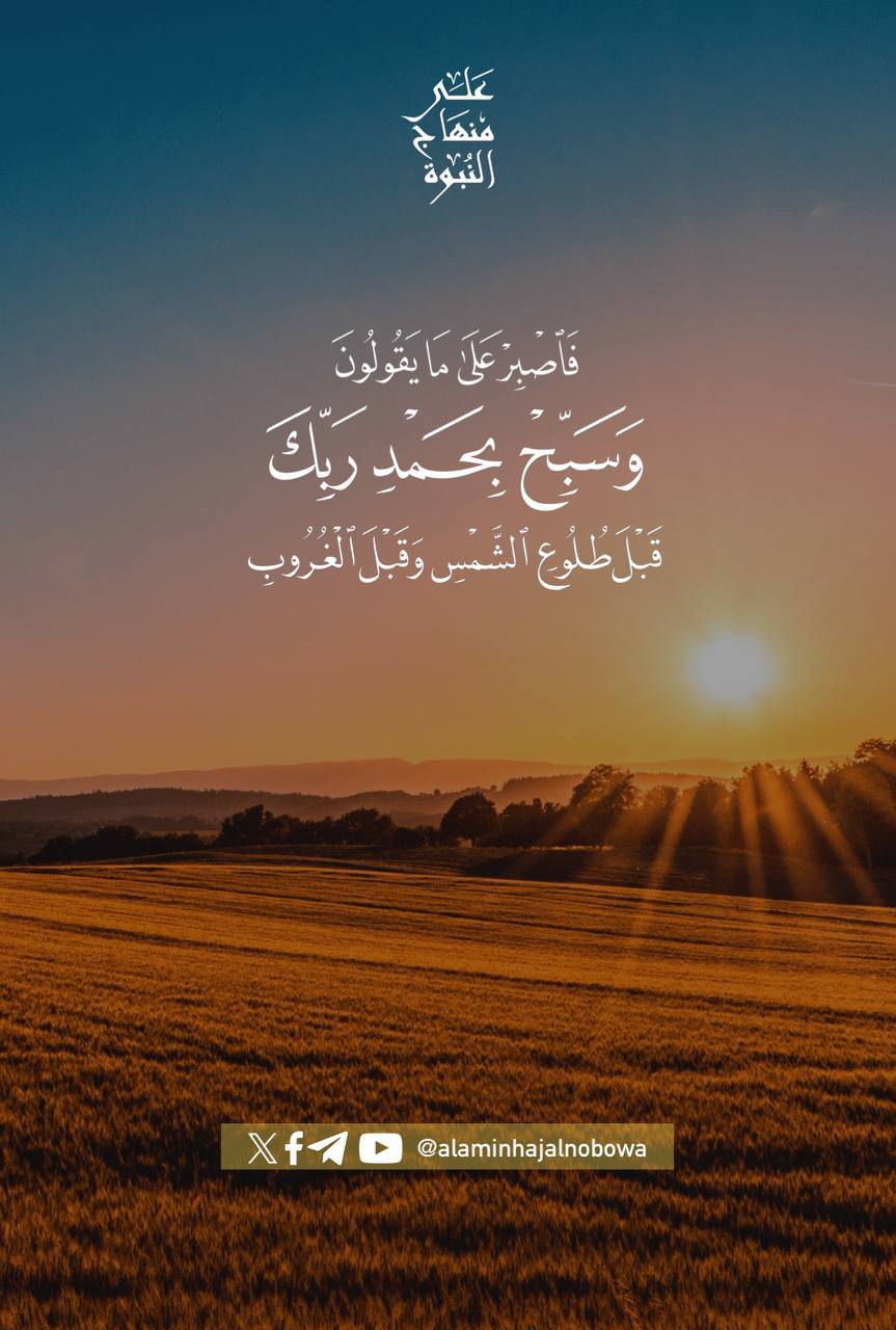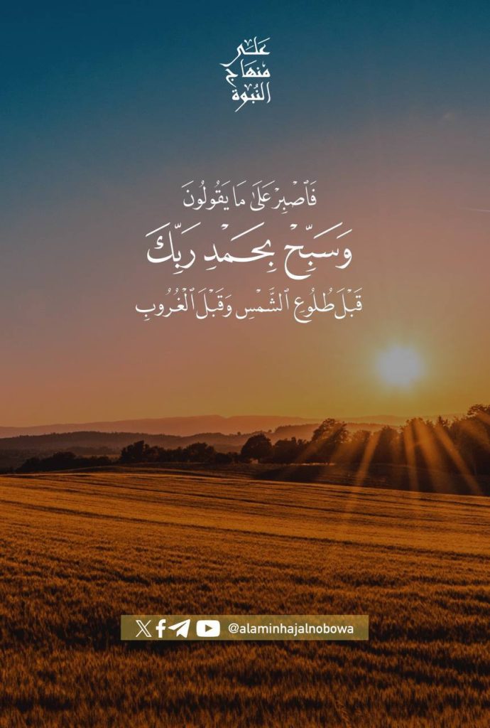 ﴿ فَاصْبِرْ عَلَىٰ مَا يَقُولُونَ وَسَبِّحْ بِحَمْدِ رَبِّكَ قَبْلَ طُلُوعِ الشَّمْسِ وَقَبْلَ غُرُوبِهَا ۖ وَمِنْ آنَاءِ اللَّيْلِ فَسَبِّحْ وَأَطْرَافَ النَّهَارِ لَعَلَّكَ تَرْضَىٰ﴾ [ طه: 130]