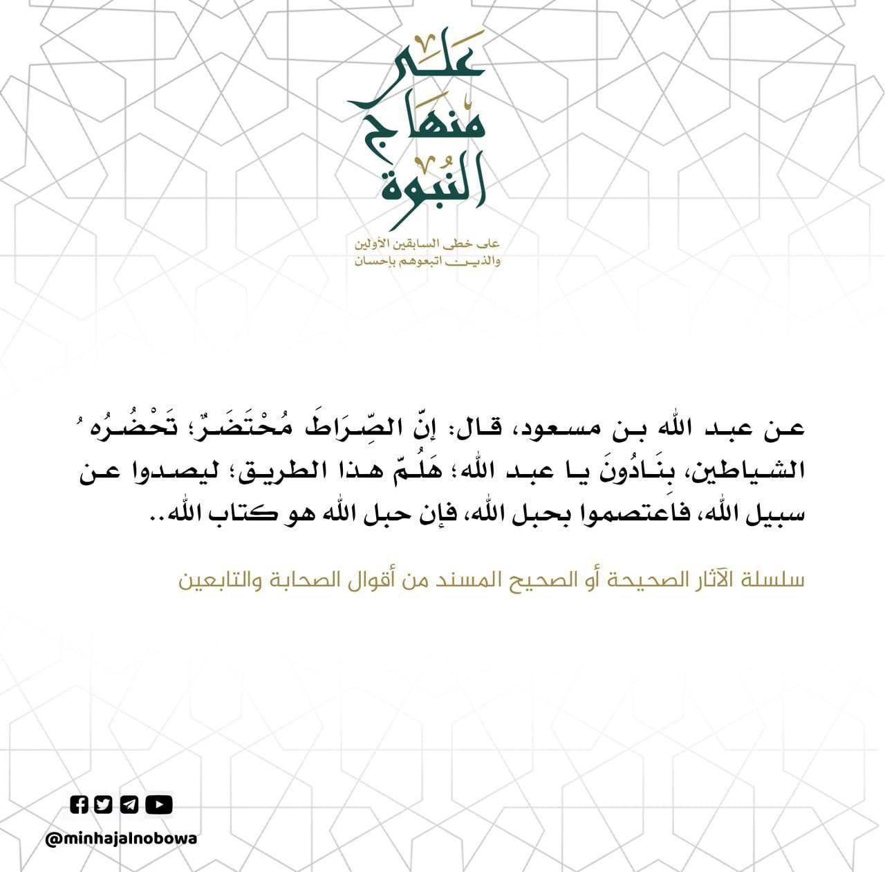 عن عبد الله بن مسعود قال: إنّ الصِّرَاطَ مُحْتَضَرٌ؛ تَحْضُرُه الشياطين، بنَادُونَ يا عبد الله؛ هَلُمَّ هذا الطريق؛ ليصدوا عن سبيل الله، فاعتصموا بحبل الله، فإن حبل الله هو كتاب الله ..