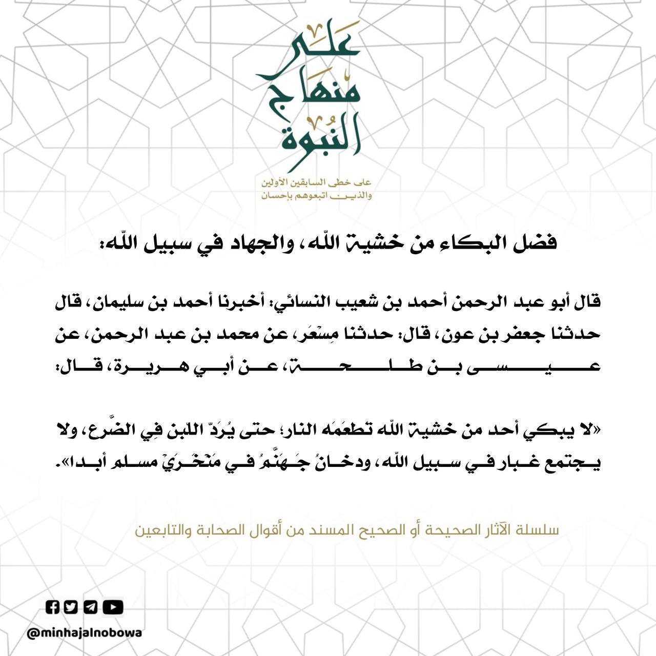 فضل البكاء من خشية الله، والجهاد في سبيل الله: قال أبو عبد الرحمن أحمد بن شعيب النسائي: أخبرنا أحمد بن سليمان، قال: حدثنا جعفر بن عون، قال: حدثنا مِسْعَر، عن محمد بن عبد الرحمن، عن عيسى بن طلحة، عن أبي هريرة، قال: «لا يبكي أحد من خشية الله تَطعَمَه النار؛ حتى يُرَدّ اللّبن فِي الضَّرع،…