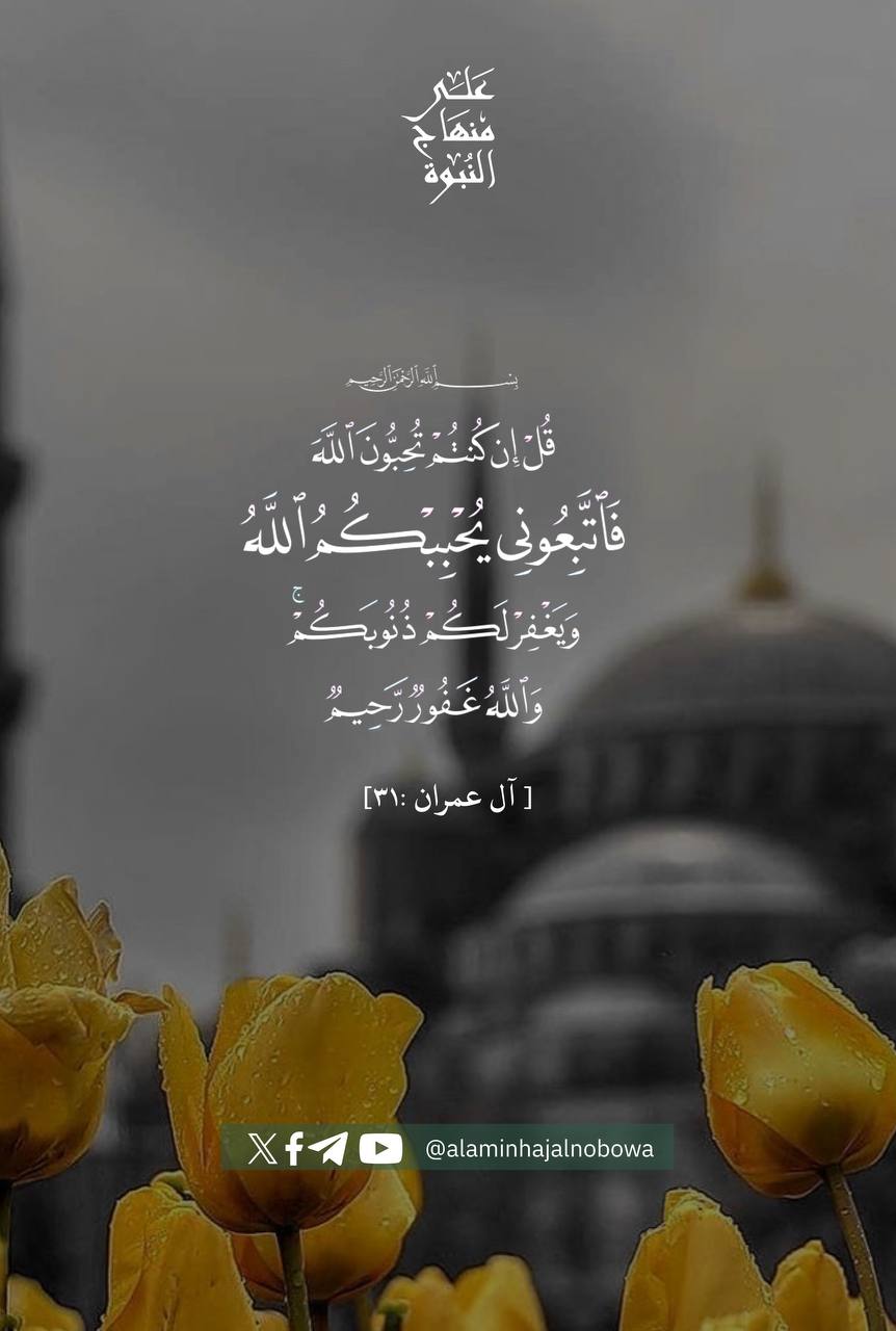 ﴿ قُلْ إِن كُنتُمْ تُحِبُّونَ اللَّهَ فَاتَّبِعُونِي يُحْبِبْكُمُ اللَّهُ وَيَغْفِرْ لَكُمْ ذُنُوبَكُمْ ۗ وَاللَّهُ غَفُورٌ رَّحِيمٌ﴾ [ آل عمران: 31]