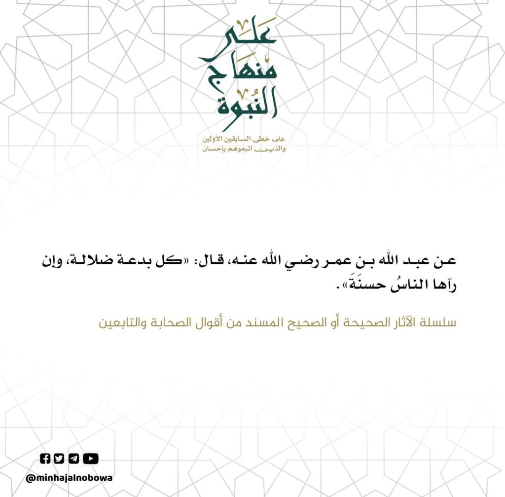 عن عبد الله بن عمر رضي الله عنه، قال: «كل بدعة ضلالة، وإن رآها الناسُ حسنَةً».
