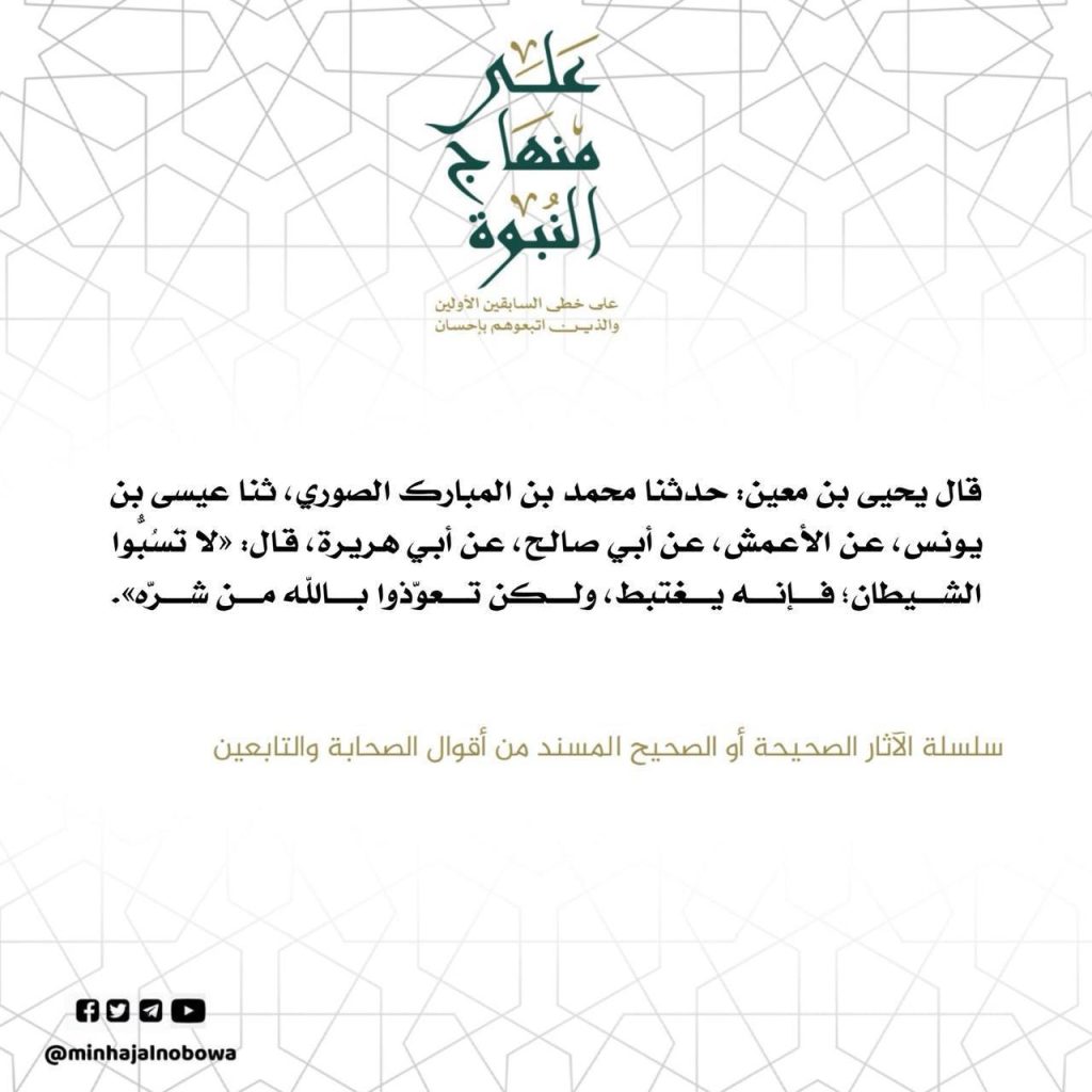 قال يحيى بن معين: حدثنا محمد بن المبارك الصوري، ثنا عيسى بن يونس، عن الأعمش، عن أبي صالح، عن أبي هريرة، قال: «لا تسُبُّوا الشيطان؛ فإنه يغتبط،ولكن تعوذوا بالله من شرّه». سلسلة الآثار الصحيحة أو الصحيح المسند من أقوال الصحابة والتابعين