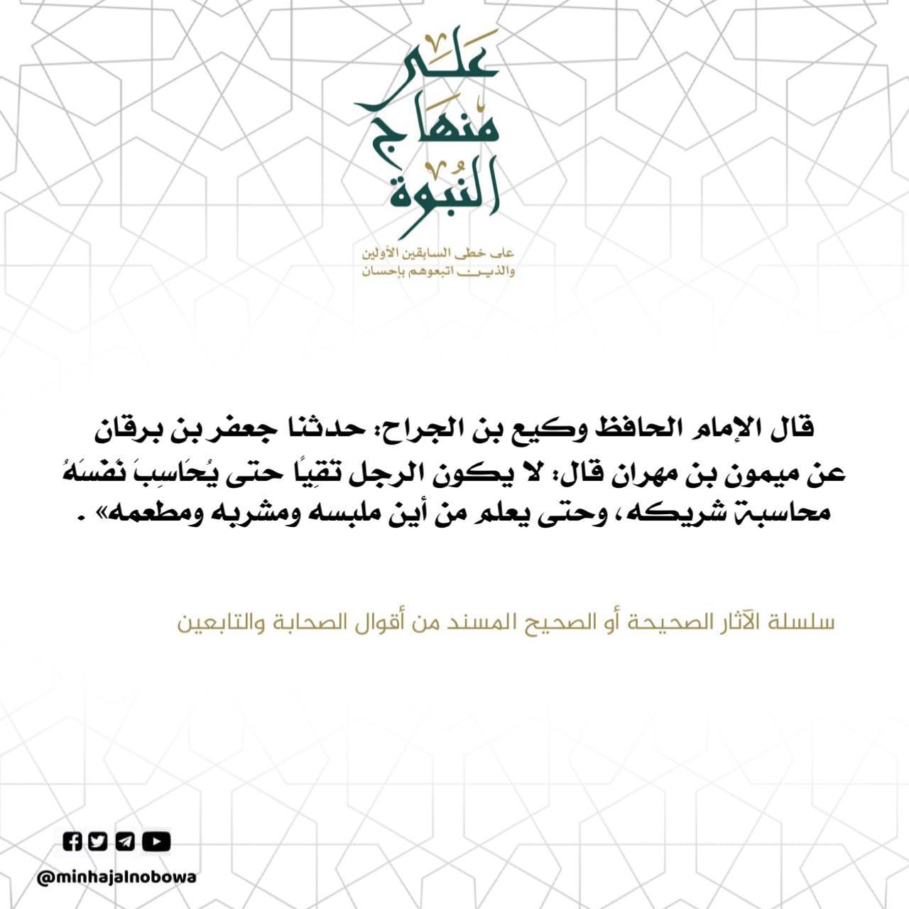 قال الإمام الحافظ وكيع بن الجراح: حدثنا جعفر بن برقان عن ميمون بن مهران قال: لا يكون الرجل تقيا حتى يُحاسب نفسه محاسبة شريكه، وحتى يعلم من أين ملبسه ومشربه ومطعمه» .