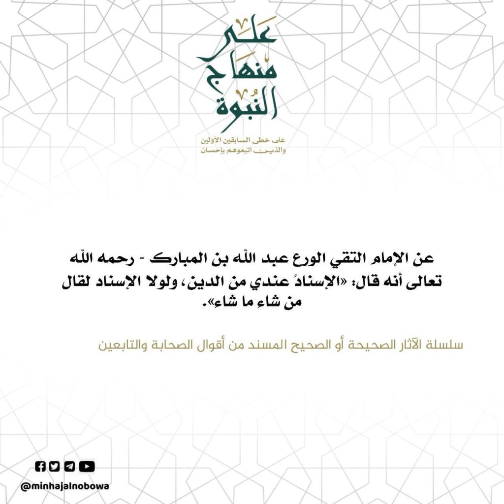 عن الإمام التقي الورع عبد الله بن المبارك - رحمه الله تعالى أنه قال: «الإسنادُ عندي من الدين، ولولا الاسناد لقال من شاء ما شاء». سلسلة الآثار الصحيحة أو الصحيح المسند من أقوال الصحابة والتابعين