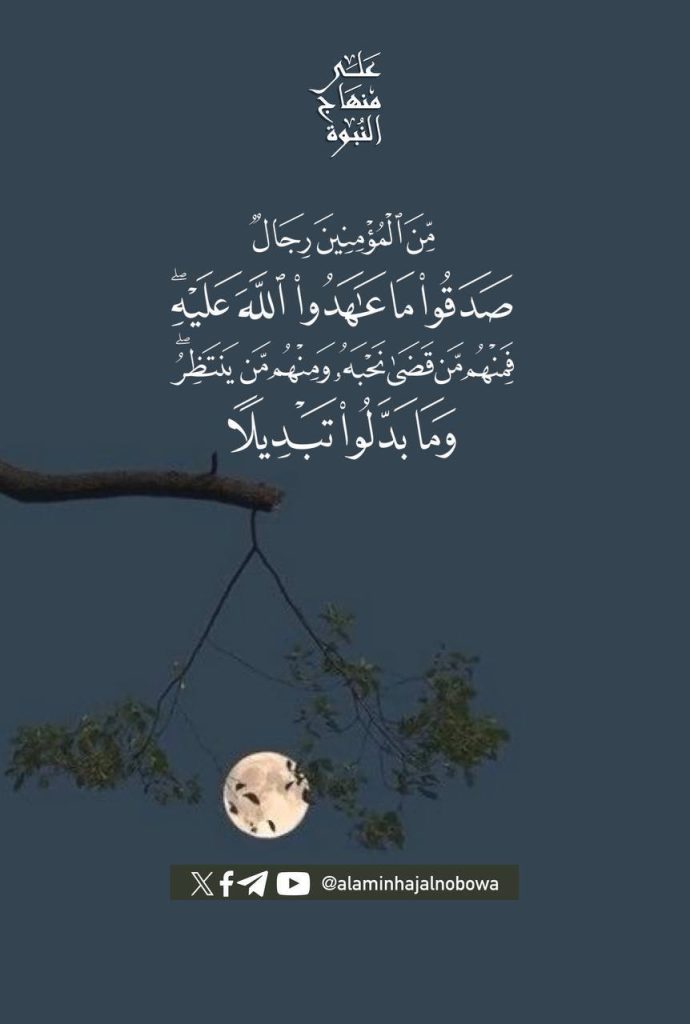﴿ مِّنَ الْمُؤْمِنِينَ رِجَالٌ صَدَقُوا مَا عَاهَدُوا اللَّهَ عَلَيْهِ ۖ فَمِنْهُم مَّن قَضَىٰ نَحْبَهُ وَمِنْهُم مَّن يَنتَظِرُ ۖ وَمَا بَدَّلُوا تَبْدِيلًا﴾ [ الأحزاب: 23]