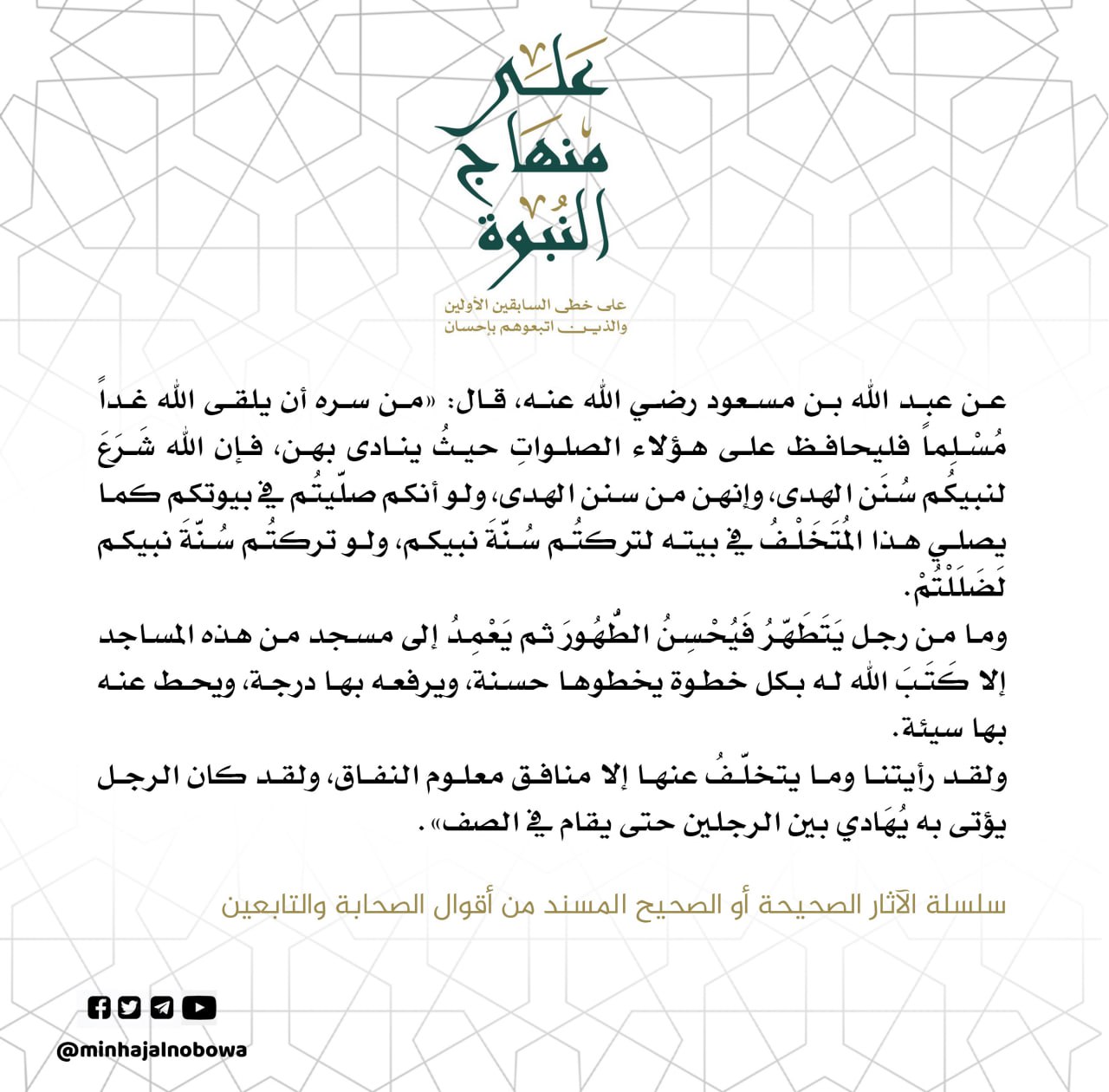 عن عبد الله بن مسعود رضي الله عنه، قال: «من سره أن يلقى الله غداً مُسْلِماً فليحافظ على هؤلاء الصلواتِ حيثُ ينادى بهن، فإن الله شَرَعَ لنبيكم سُنَن الهدى، وإنهن من سنن الهدى، ولو أنكم صليتم في بيوتكم كما يصلي هذا المُتَخَلْفُ في بيته لتركتُم سُنّةً نبيكم، ولو تركتُم سُنّةً نبيكم لضللتم.