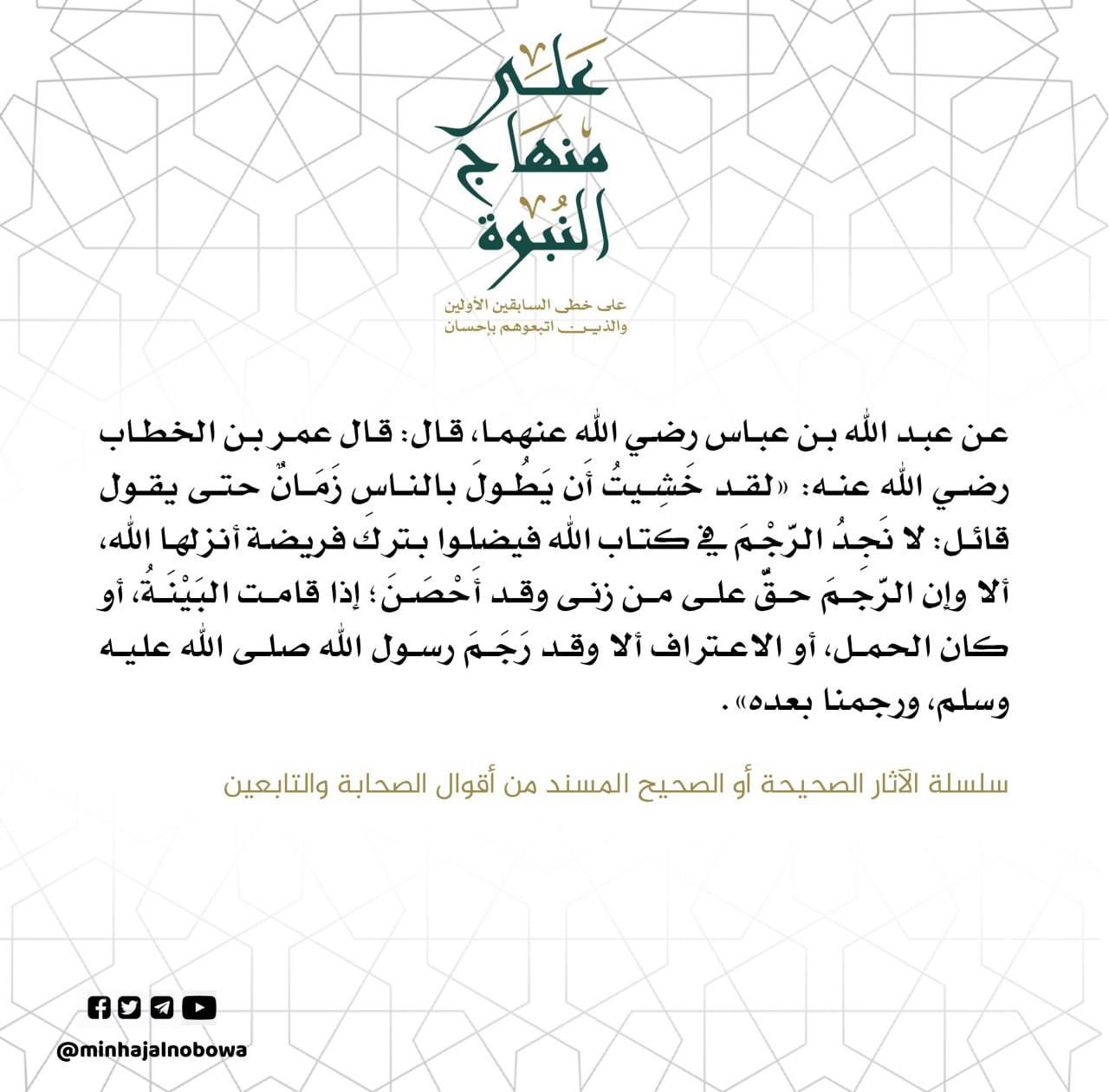 عن عبد الله بن عباس رضي بن عباس رضي الله عنهما قال: قال عمر بن الخطاب رضي الله عنه: «لقد خَشِيتُ أَن يَطُولَ بالناس زَمَانٌ حتى يقول قائل : لا تَجِدُ الرِّجْمَ في كتاب الله فيضلوا بترك فريضة أنزلها الله، ألا وإن الرّجم حق على من زنى وقد أَحْصَنَ؛ إذا قامت البَيْنَةُ، أو كان الحمل،…