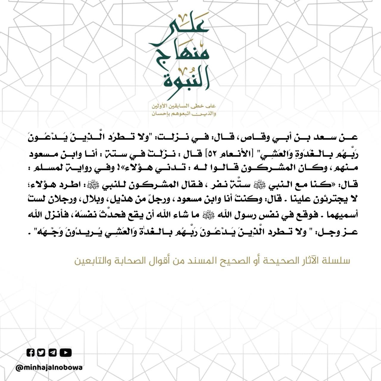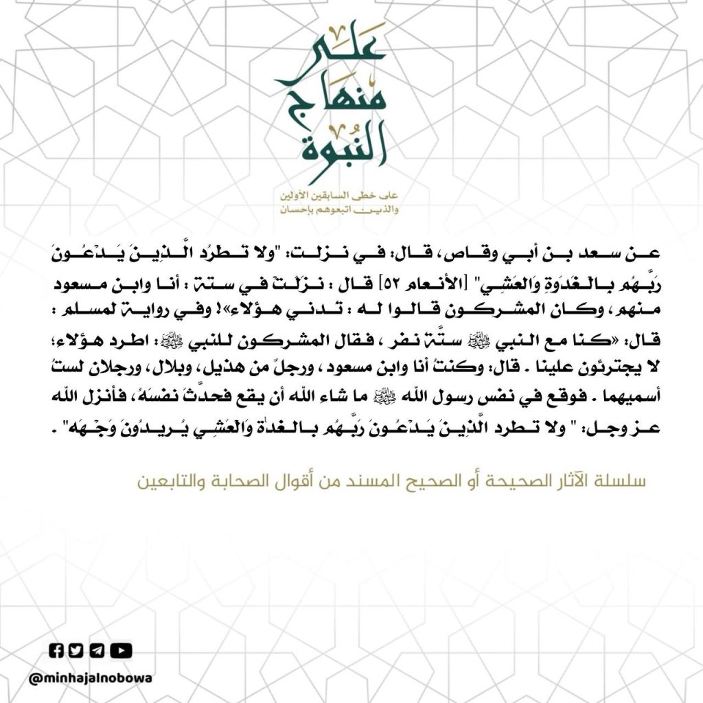 عن سعد بن أبي وقاص، قال: في نزلت: "ولا" تطرد الَّذِينَ يَدَعُونَ رَبِّهُم بالعَدَوةِ وَالعَشِي" [الأنعام ٥٢] قال : نزلت في ستة : أنا وابن مسعود منهم ، وكان المشركون قالوا له : تدني هؤلاء» ! وفي رواية لمسلم : قال: «كنا مع النبي ستة نفر ، فقال المشركون للنبي : اطرد هؤلاء لا يجترئون…