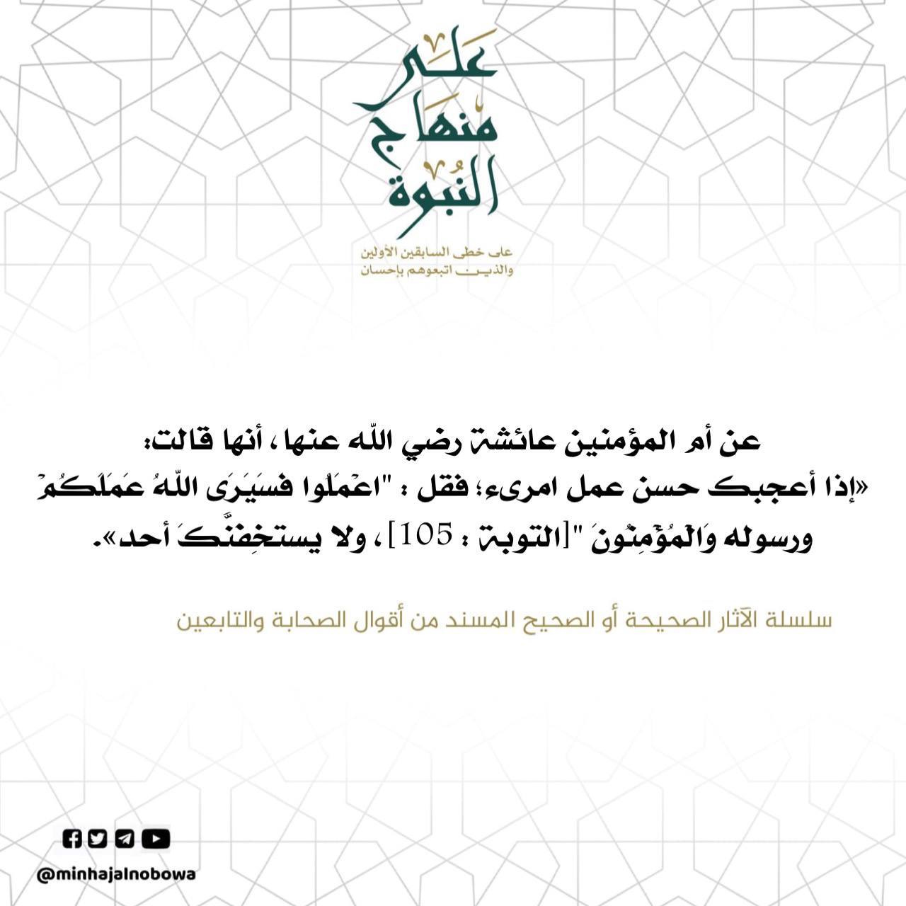 عن أم المؤمنين عائشة رضي الله عنها ، أنها قالت: «إذا أعجبك حسن عمل امرىء ؛ فقل : "اعْمَلُوا فَسَيَرَى اللَّهُ عَمَلَكُمْ ورسوله والمُؤْمِنونَ " [التوبة : 105] ، ولا يستخفنَّك أحد».