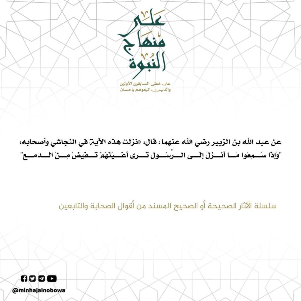 عن عبد الله بن الزبير رضي الله عنهما قال: نزلت هذه الآية في النجاشي وأصحابه "وَإِذَا سَمِعُوا مَا أنزل إلى الرسول ترى أعينهم تفيض من الدمع"