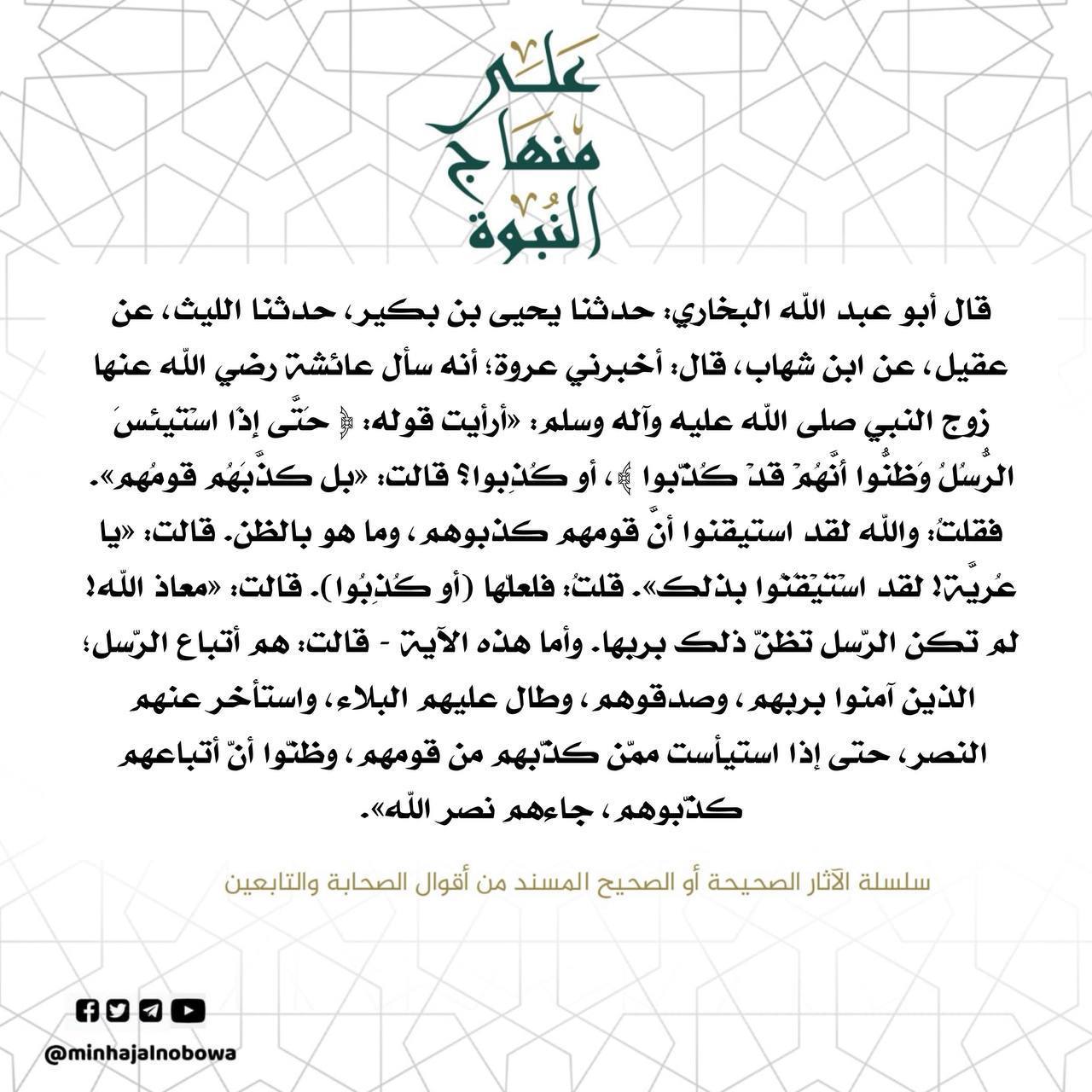 قال أبو عبد الله البخاري: حدثنا يحيى بن بكير، حدثنا الليث، عن عقيل، عن ابن شهاب، قال: أخبرني عروة؛ أنه سأل عائشة رضي الله عنها زوج النبي صلى الله عليه وآله وسلم: «أرأيت قوله: ﴿حتّى إذا استيئسَ الرُّسُلُ وَظنُوا أَنَّهُمْ قدْ كُذِّبوا﴾ ،أو كَذِبوا؟ قالت: «بل كذَّبَهُم قومُهم». فقلتُ: والله لقد استيقنوا أن قومهم كذبوهم،…