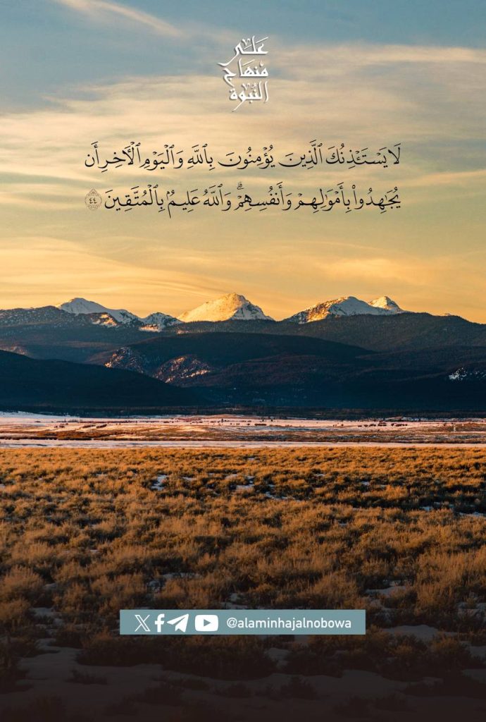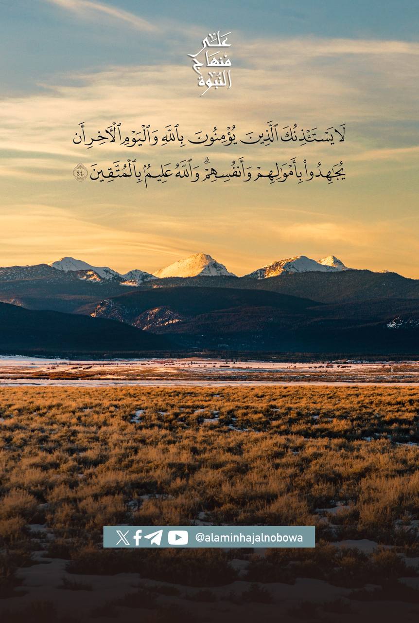 ﴿ لَا يَسْتَأْذِنُكَ الَّذِينَ يُؤْمِنُونَ بِاللَّهِ وَالْيَوْمِ الْآخِرِ أَن يُجَاهِدُوا بِأَمْوَالِهِمْ وَأَنفُسِهِمْ ۗ وَاللَّهُ عَلِيمٌ بِالْمُتَّقِينَ﴾ [ سورة التوبة: 44]