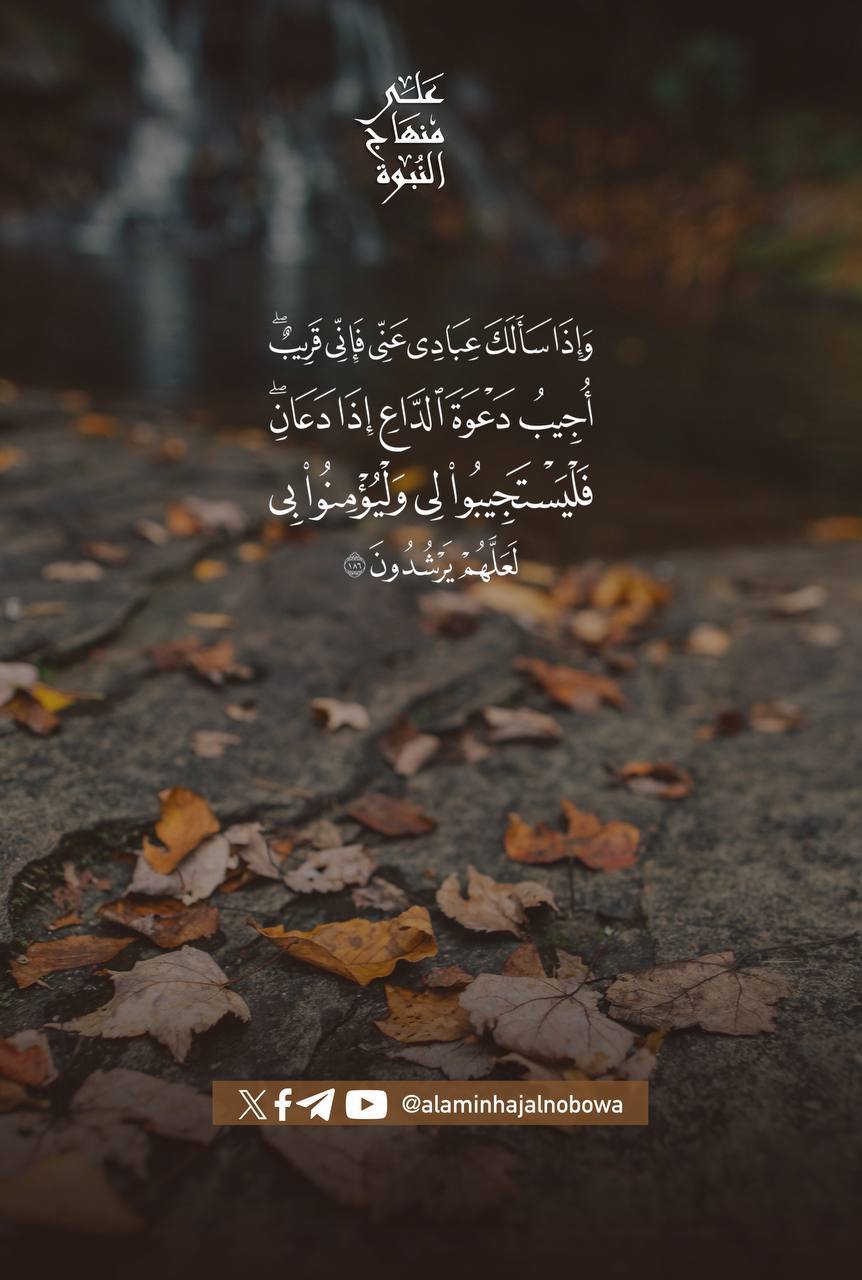﴿ وَإِذَا سَأَلَكَ عِبَادِي عَنِّي فَإِنِّي قَرِيبٌ ۖ أُجِيبُ دَعْوَةَ الدَّاعِ إِذَا دَعَانِ ۖ فَلْيَسْتَجِيبُوا لِي وَلْيُؤْمِنُوا بِي لَعَلَّهُمْ يَرْشُدُونَ﴾ [ البقرة: 186]