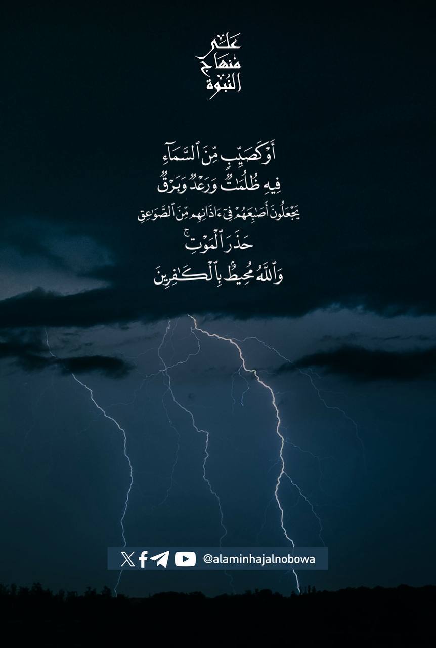 ﴿ أَوْ كَصَيِّبٍ مِّنَ السَّمَاءِ فِيهِ ظُلُمَاتٌ وَرَعْدٌ وَبَرْقٌ يَجْعَلُونَ أَصَابِعَهُمْ فِي آذَانِهِم مِّنَ الصَّوَاعِقِ حَذَرَ الْمَوْتِ ۚ وَاللَّهُ مُحِيطٌ بِالْكَافِرِينَ﴾ [ البقرة: 19]