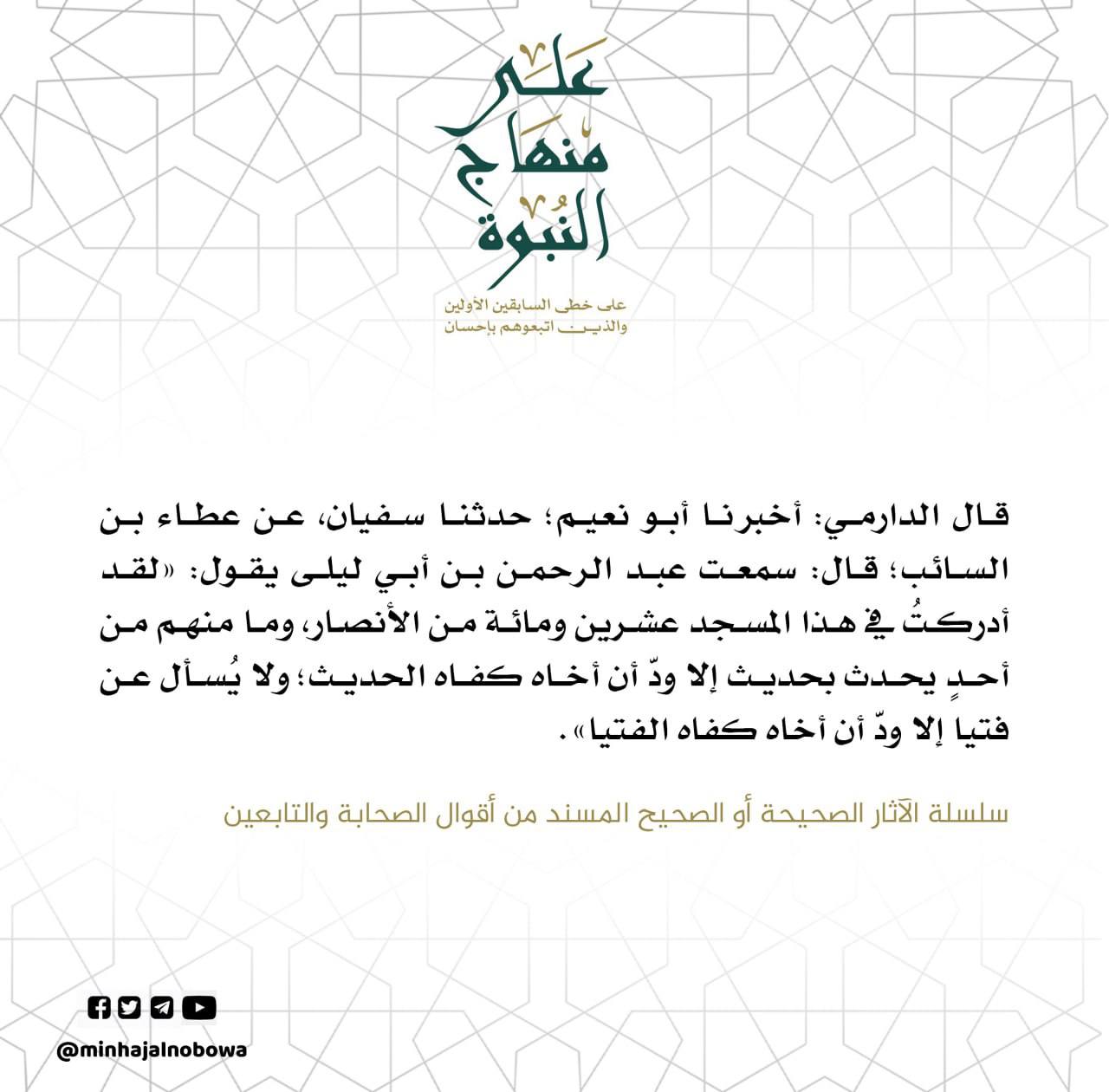 قال الدارمي: أخبرنا أبو نعيم؛ حدثنا سفيان عن عطاء بن السائب؛ قال: سمعت عبد الرحمن بن أبي ليلى يقول: «لقد أدركتُ في هذا المسجد عشرين ومائة من الأنصار، وما منهم من أحد يحدث بحديث إلا ودّ أن أخاه كفاه الحديث ؛ ولا يُسأل عن فتيا إلا ودّ أن أخاه كفاه الفتيا».