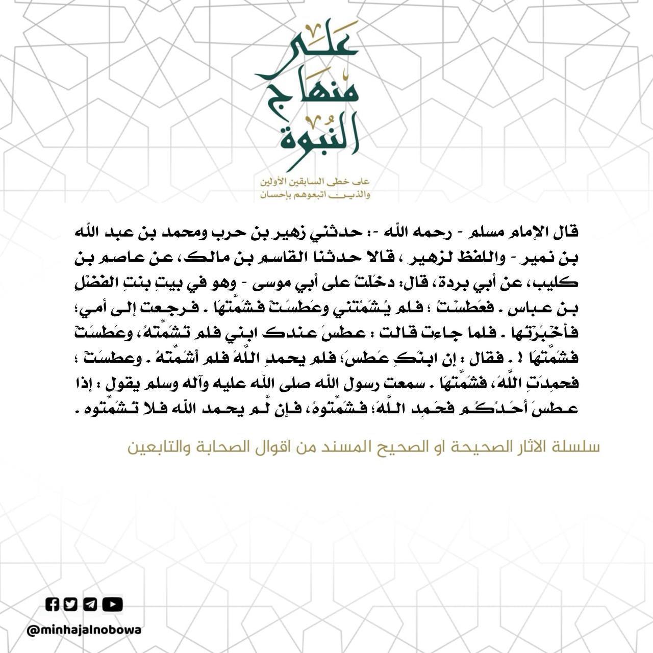 قال الإمام مسلم - رحمه الله -: حدثني زهير بن حرب ومحمد بن عبد الله بن نمير - واللفظ لزهير، قالا حدثنا القاسم بن مالك، عن عاصم بن كليب، عن أبي بردة، قال: دخلت على أبي موسى - وهو في بيت بنت الفضل بن عباس . فعَطسْتُ ؛ فلم يُشَمُتني وعَطسَتْ فشَمَّتها. فرجعت إلى أمي؛…
