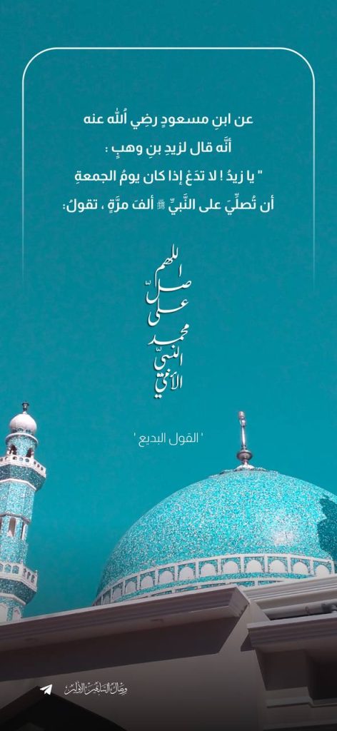 عن ابن مسعود رضي الله عنه أنه قال لزيد بن وهب: “يا زيد بن وهب، لا تدع إذا كان يوم الجمعة أن تصلي على النبي ﷺ ألف مرة”. تقول: اللهم صل على محمد صلى الله عليه وسلم.