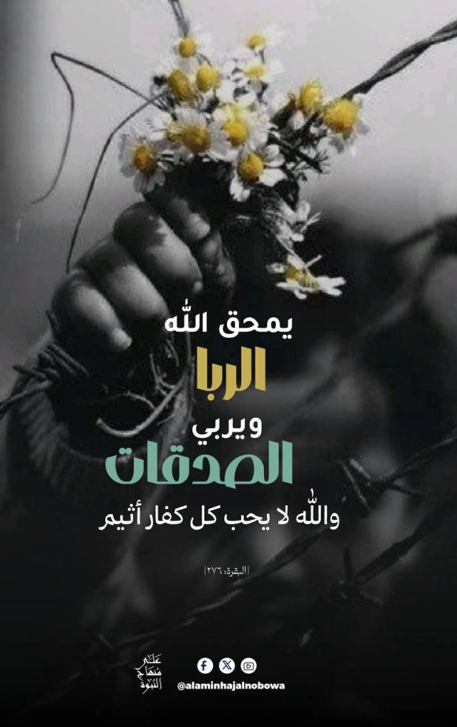 ﴿ يَمْحَقُ اللَّهُ الرِّبَا وَيُرْبِي الصَّدَقَاتِ ۗ وَاللَّهُ لَا يُحِبُّ كُلَّ كَفَّارٍ أَثِيمٍ﴾ [ البقرة: 276]
