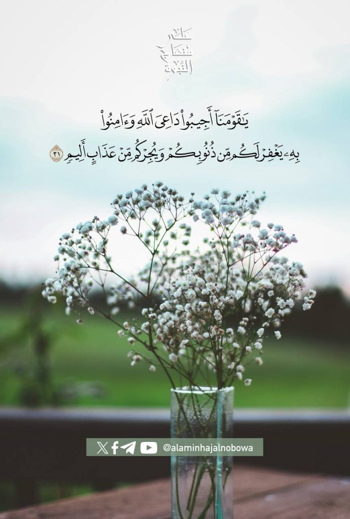﴿ يَا قَوْمَنَا أَجِيبُوا دَاعِيَ اللَّهِ وَآمِنُوا بِهِ يَغْفِرْ لَكُم مِّن ذُنُوبِكُمْ وَيُجِرْكُم مِّنْ عَذَابٍ أَلِيمٍ﴾ [ سورة الأحقاف: 31]