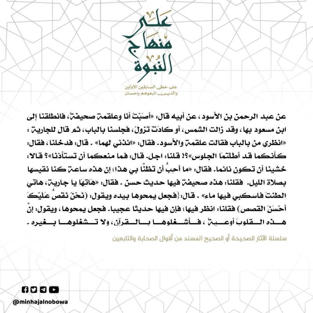 عن عبد الرحمن بن الأسود، عن أبيه قال: «أصَبْت أنا وعلقمة صحيفة، فانطلقنا إلى ابن مسعود بهاء، وقد زالت الشمس، أو كادت تزولُ، فجلسنا بالباب، ثم قال للجارية : «انظري من بالباب فقالت…