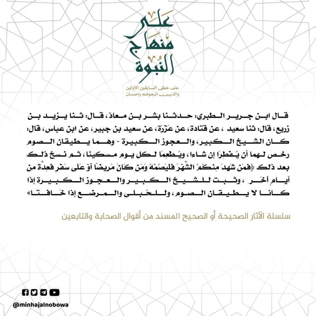 قال ابن جرير الطبري: حدثنا بشر بن معاذ،قال: ثنا يزيد بن زريع، قال: ثنا سعيد، عن قتادة، عن عروة، عن سعيد بن جبير، عن ابن عباس، قال: كان الشيخ الكبير، والعجوز الكبيرة -…
