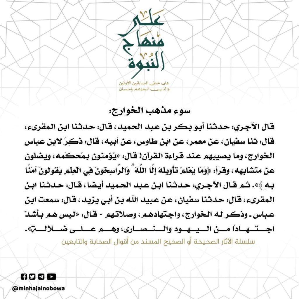 سوء مذهب الخوارج: قال الآجري: حدثنا أبو بكر بن عبد الحميد، قال: حدثنا ابن المقرىء، قال: ثنا سفيان، عن معمر، عن ابن طاوس، عن أبيه، قال: ذُكر لابن عباس الخوارج، وما يصيبهم عند…