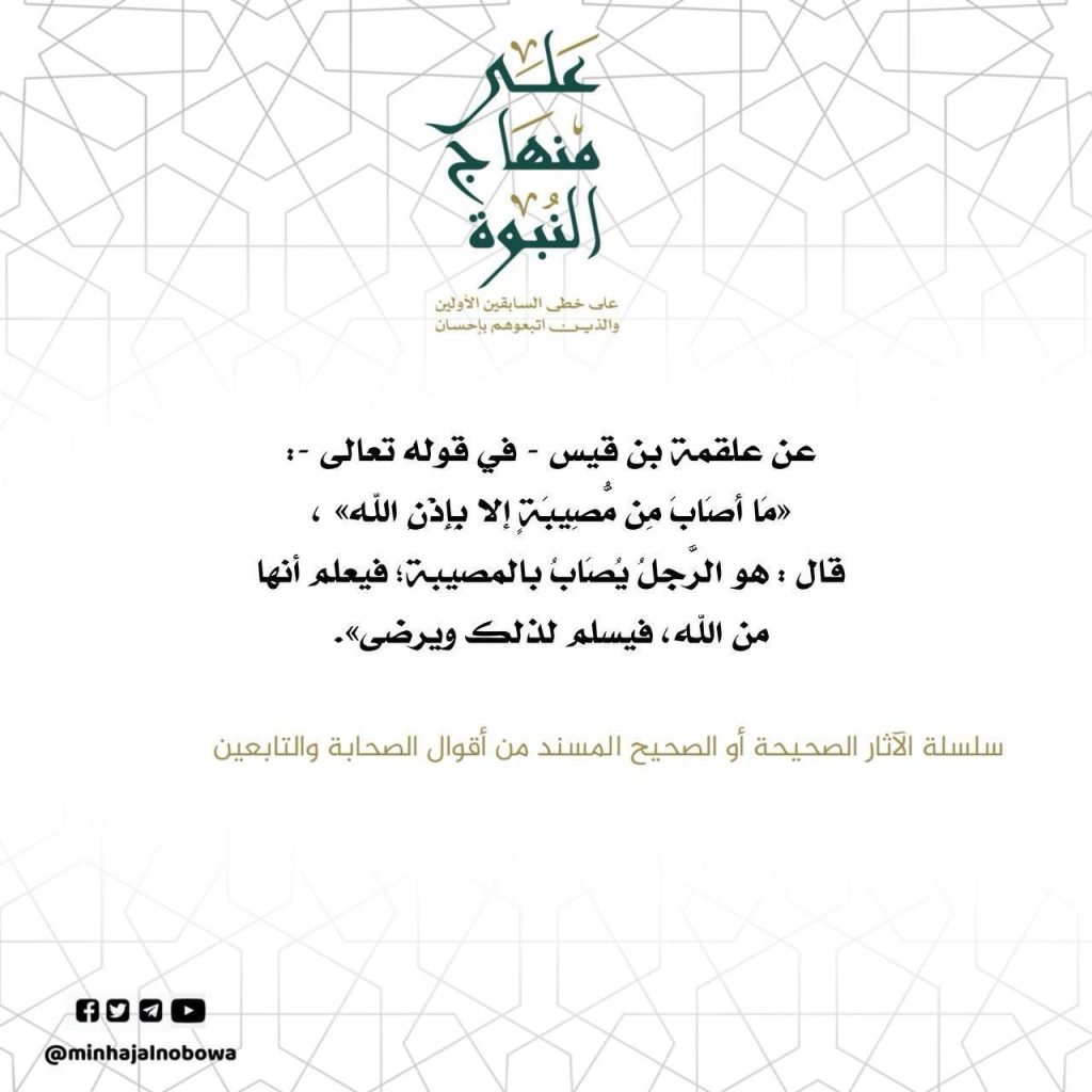 عن علقمة بن قيس - في قوله تعالى -: «ما أصابَ من مُصِيبَةٍ إلا بإذن اللّه» قال : هو الرجل يُصَابُ بالمصيبة؛ فيعلم أنها من الله، فيسلم لذلك ويرضى». سلسلة الآثار الصحيحة أو…