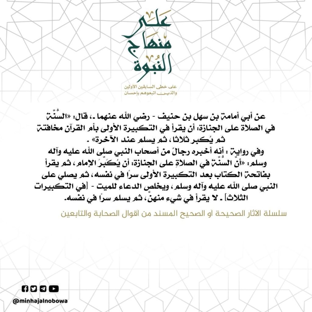 عن أبي أمامة بن سهل بن حنيف - رضي الله عنهما-، قال: «السُّنّة في الصلاة على الجنازة: أن يقرأ في التكبيرة الأولى بأم القرآن مخافتة ثم يُكبر ثلاثا، ثم يسلم عند الآخرة» .…
