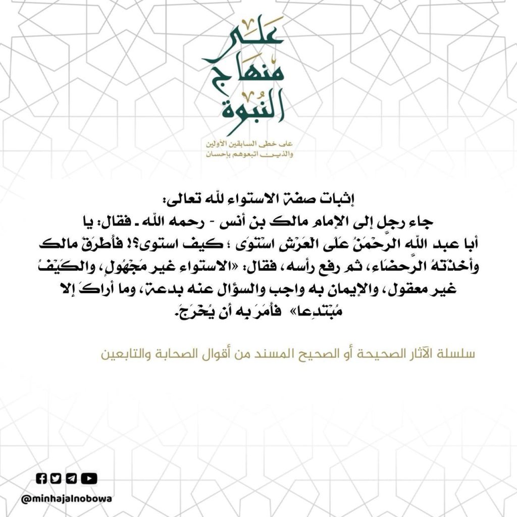 عن سفيان بن عيينة، قال: سُئِلَ ربيعة عن قول الله تعالى: ﴿الرحمن على العرش استوى﴾؛ كيف استوى؟ قال: «الاستواء غير مجهول، والكيف غير معقول، ومِنَ اللّهِ الرِّسالة، وعلى الرسول البلاغ؛ وعلينا التصّديقُ». سلسلة…